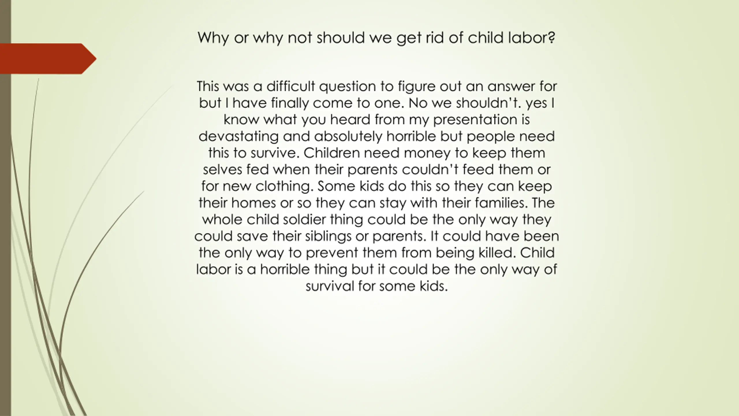 Why or why not should we get rid of child labor? This was a difficult question to figure out an answer for but I have finally come to one. No we shouldn t. yes I know what you heard from my presentation is devastating and absolutely horrible but people need this to survive. Children need money to keep them selves fed when their parents couldn t feed them or for new clothing. Some kids do this so they can keep their homes or so they can stay with their families. The whole child soldier thing could be the only way they could save their siblings or parents. It could have been the only way to prevent them from being killed. Child labor is a horrible thing but it could be the only way of survival for some kids.