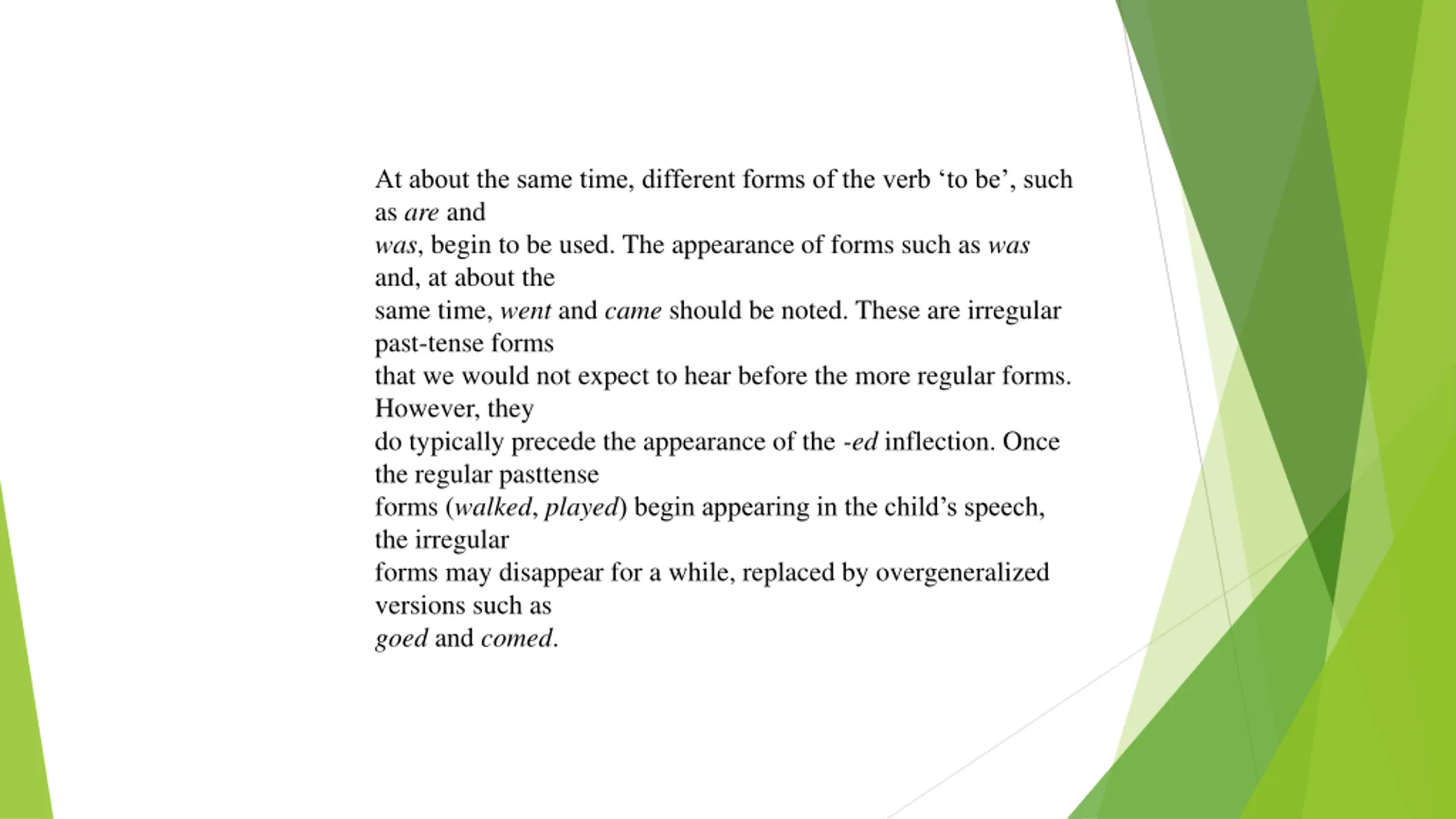 At about the same time, different forms of the verb to be, such as are and was, begin to be used. The appearance of forms such as was and, at about the same time, went and came should be noted. These are irregular past-tense forms that we would not expect to hear before the more regular forms. However, they do typically precede the appearance of the -ed inflection. Once the regular pasttense forms (walked, played) begin appearing in the child s speech, the irregular forms may disappear for a while, replaced by overgeneralized versions such as goed and comed.
