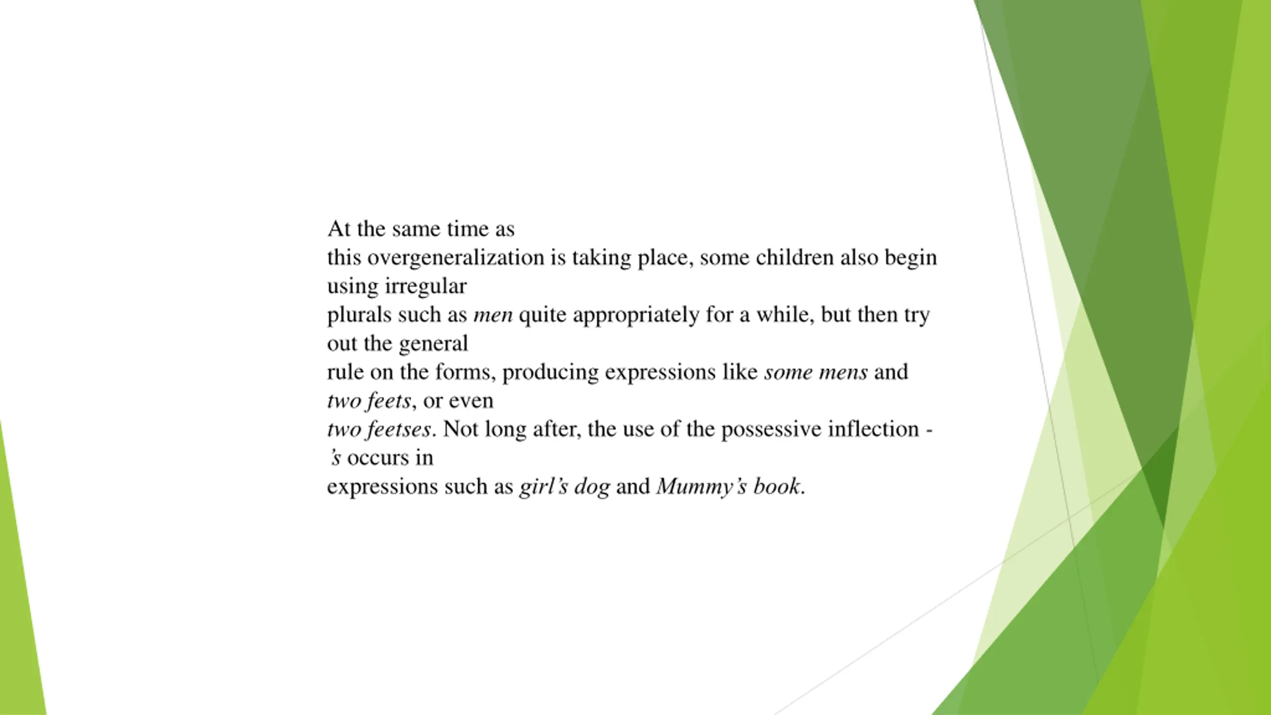 At the same time as this overgeneralization is taking place, some children also begin using irregular plurals such as men quite appropriately for a while, but then try out the general rule on the forms, producing expressions like some mens and two feets, or even two feetses. Not long after, the use of the possessive inflection - s occurs in expressions such as girl s dog and Mummy s book.