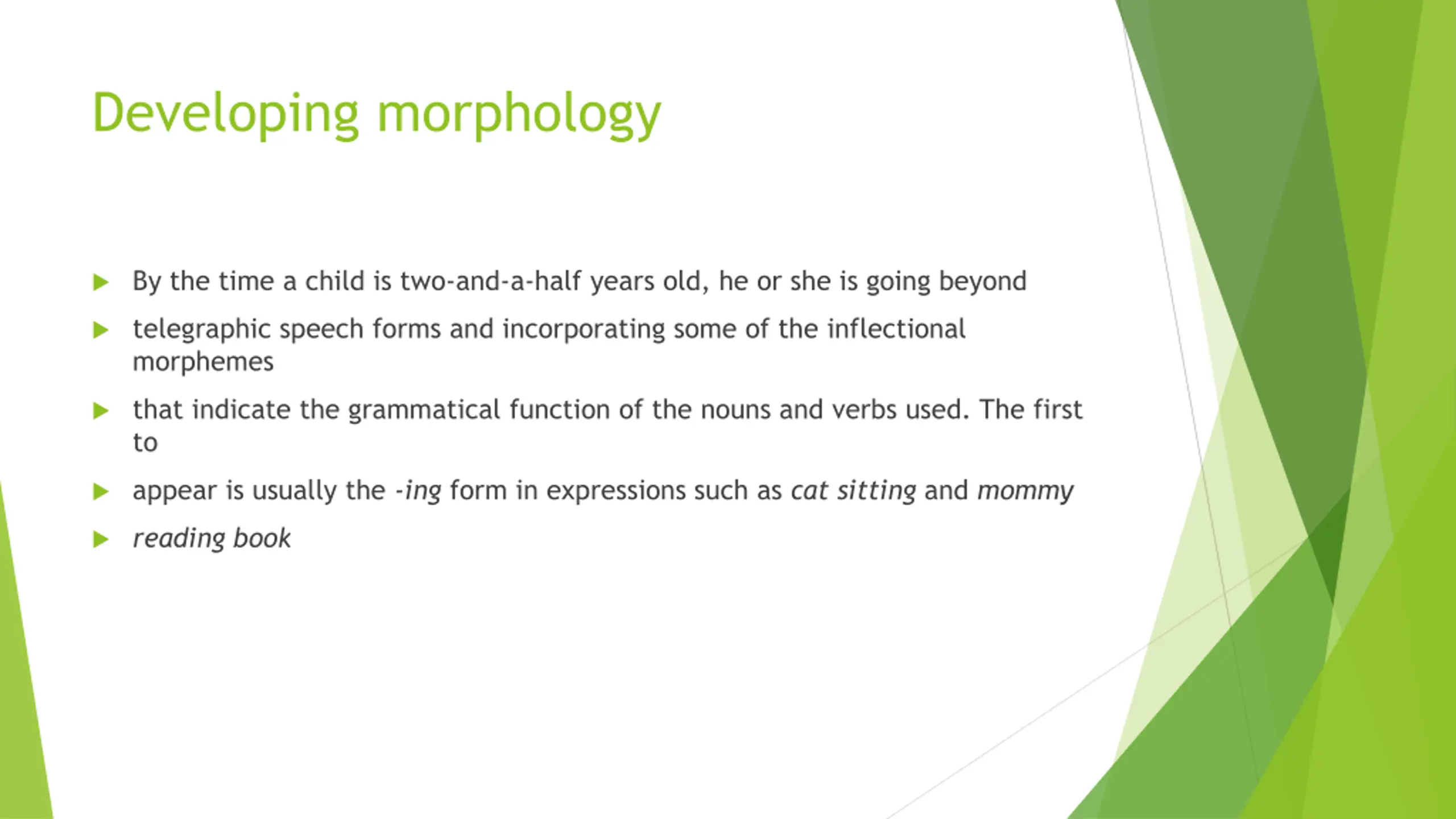 Developing morphology By the time a child is two-and-a-half years old, he or she is going beyond telegraphic speech forms and incorporating some of the inflectional morphemes that indicate the grammatical function of the nouns and verbs used. The first to appear is usually the -ing form in expressions such as cat sitting and mommy reading book