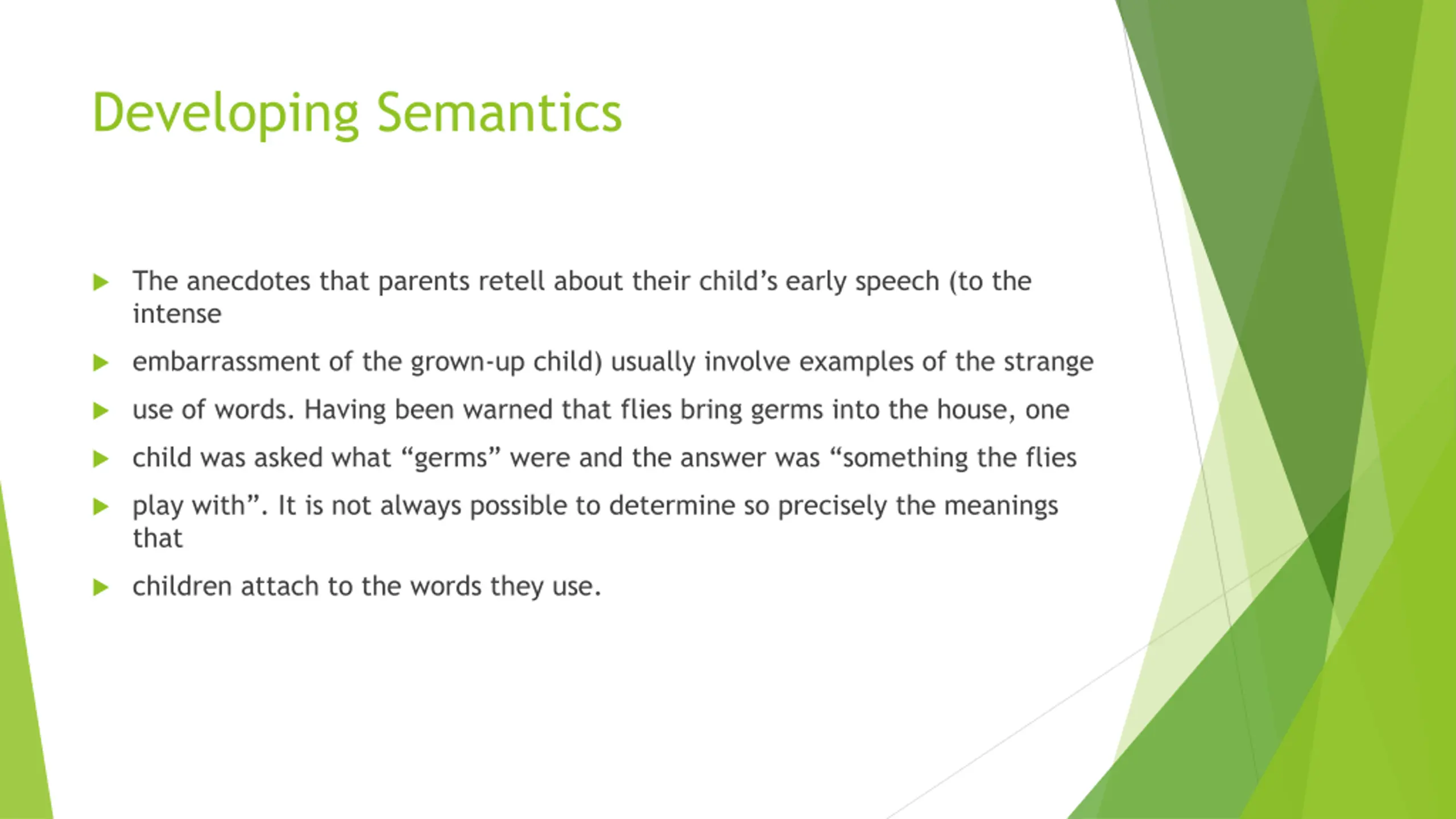 Developing Semantics The anecdotes that parents retell about their child s early speech (to the intense embarrassment of the grown-up child) usually involve examples of the strange use of words. Having been warned that flies bring germs into the house, one child was asked what germs were and the answer was something the flies play with . It is not always possible to determine so precisely the meanings that children attach to the words they use.