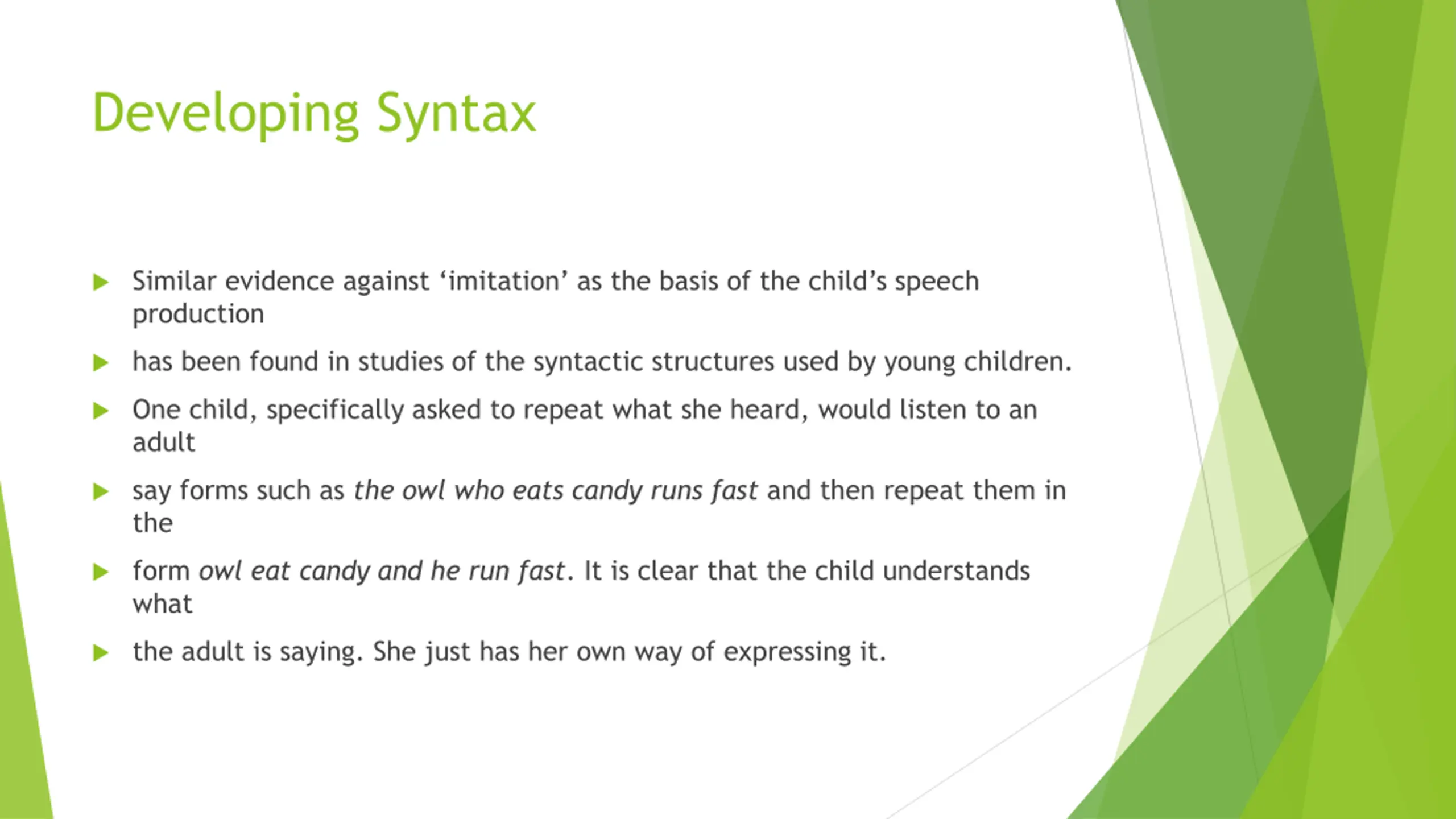 Developing Syntax Similar evidence against imitation as the basis of the child s speech production has been found in studies of the syntactic structures used by young children. One child, specifically asked to repeat what she heard, would listen to an adult say forms such as the owl who eats candy runs fast and then repeat them in the form owl eat candy and he run fast. It is clear that the child understands what the adult is saying. She just has her own way of expressing it.