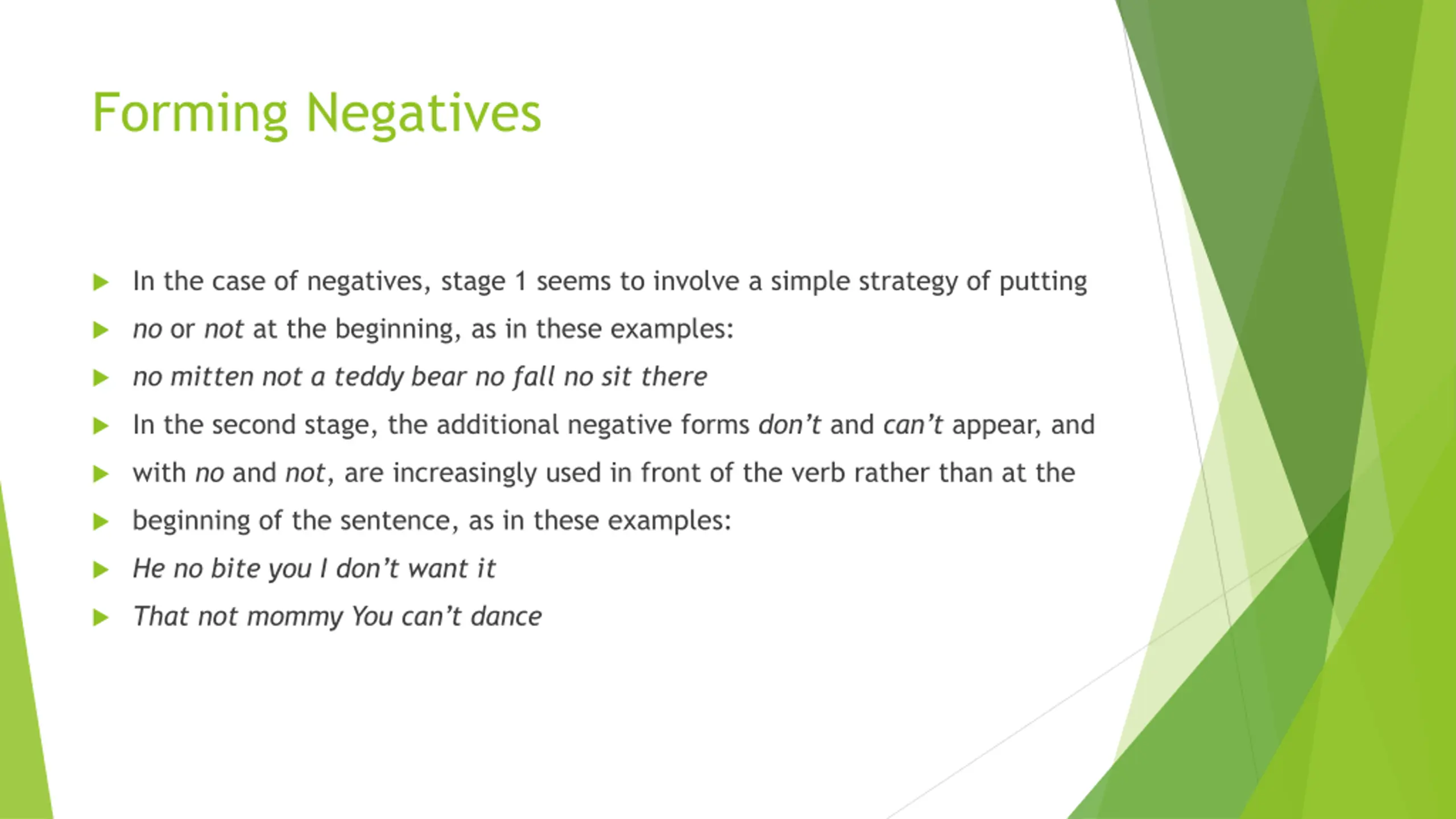 Forming Negatives In the case of negatives, stage 1 seems to involve a simple strategy of putting no or not at the beginning, as in these examples: no mitten not a teddy bear no fall no sit there In the second stage, the additional negative forms don t and can t appear, and with no and not, are increasingly used in front of the verb rather than at the beginning of the sentence, as in these examples: He no bite you I don t want it That not mommy You can t dance