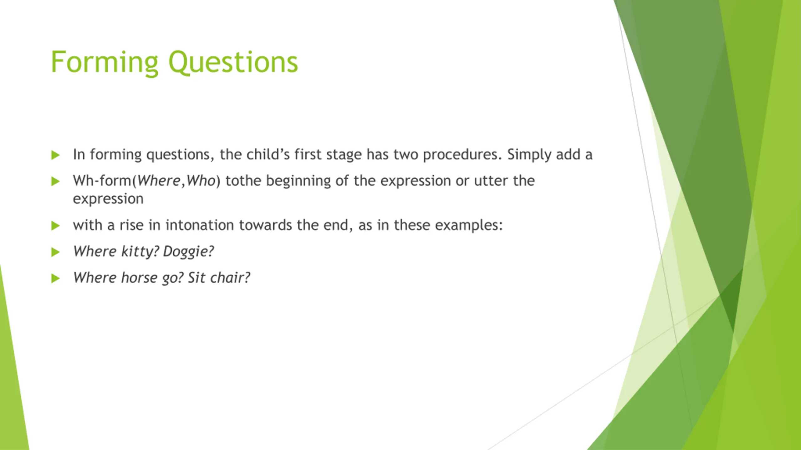 Forming Questions In forming questions, the child s first stage has two procedures. Simply add a Wh-form(Where,Who) tothe beginning of the expression or utter the expression with a rise in intonation towards the end, as in these examples: Where kitty? Doggie? Where horse go? Sit chair?