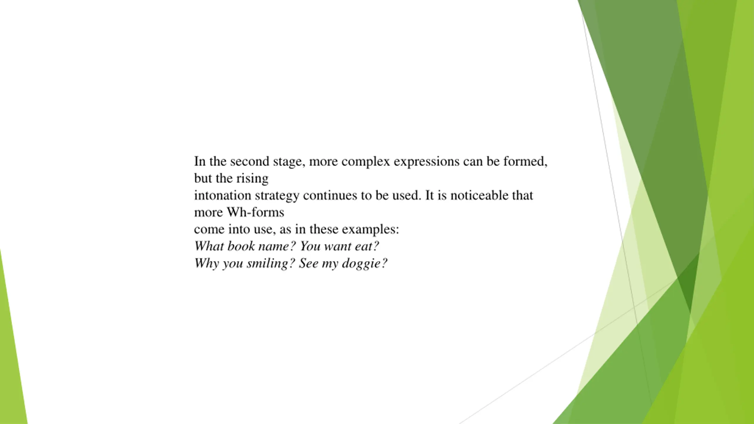 In the second stage, more complex expressions can be formed, but the rising intonation strategy continues to be used. It is noticeable that more Wh-forms come into use, as in these examples: What book name? You want eat? Why you smiling? See my doggie?