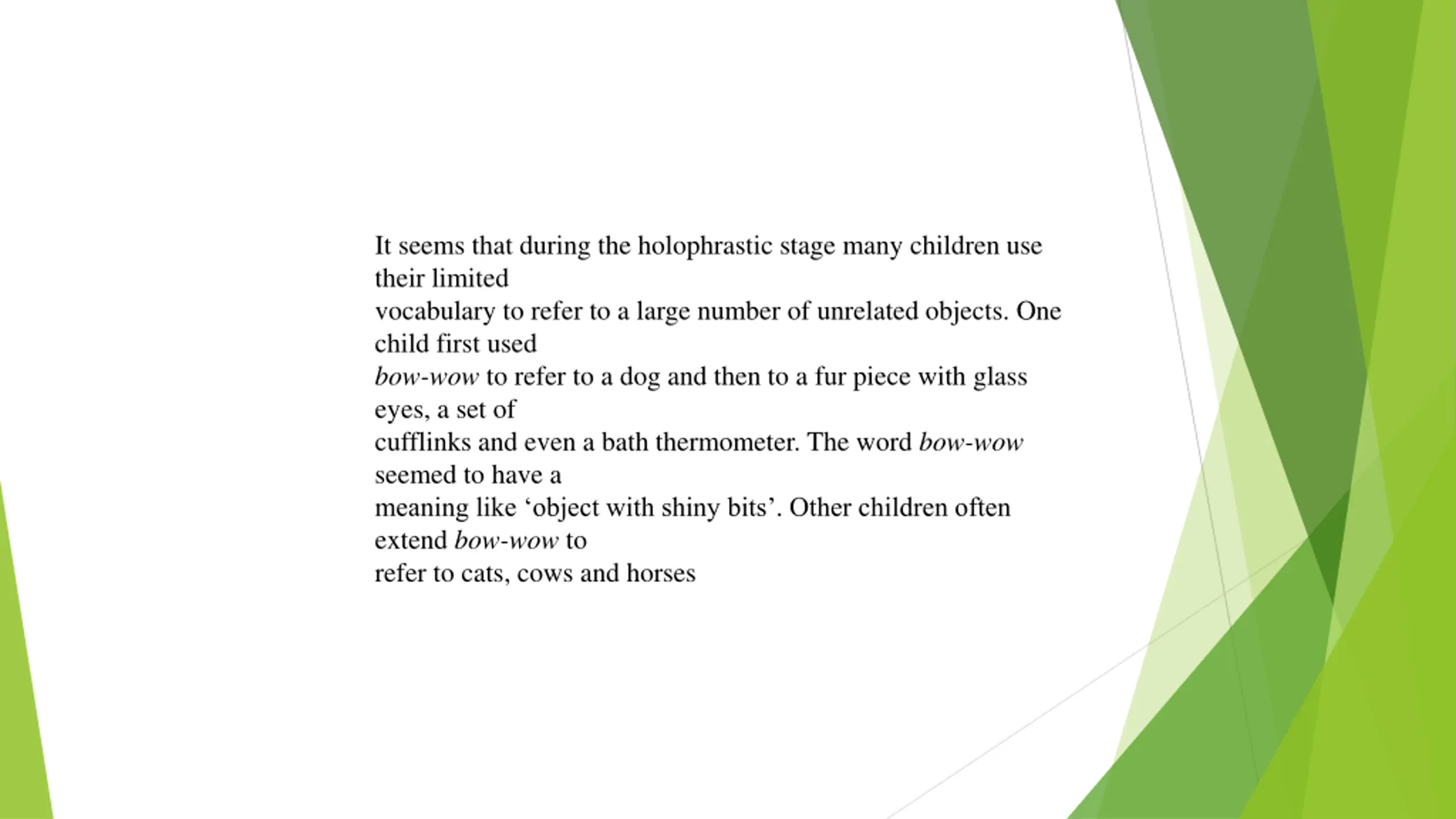 It seems that during the holophrastic stage many children use their limited vocabulary to refer to a large number of unrelated objects. One child first used bow-wow to refer to a dog and then to a fur piece with glass eyes, a set of cufflinks and even a bath thermometer. The word bow-wow seemed to have a meaning like object with shiny bits . Other children often extend bow-wow to refer to cats, cows and horses