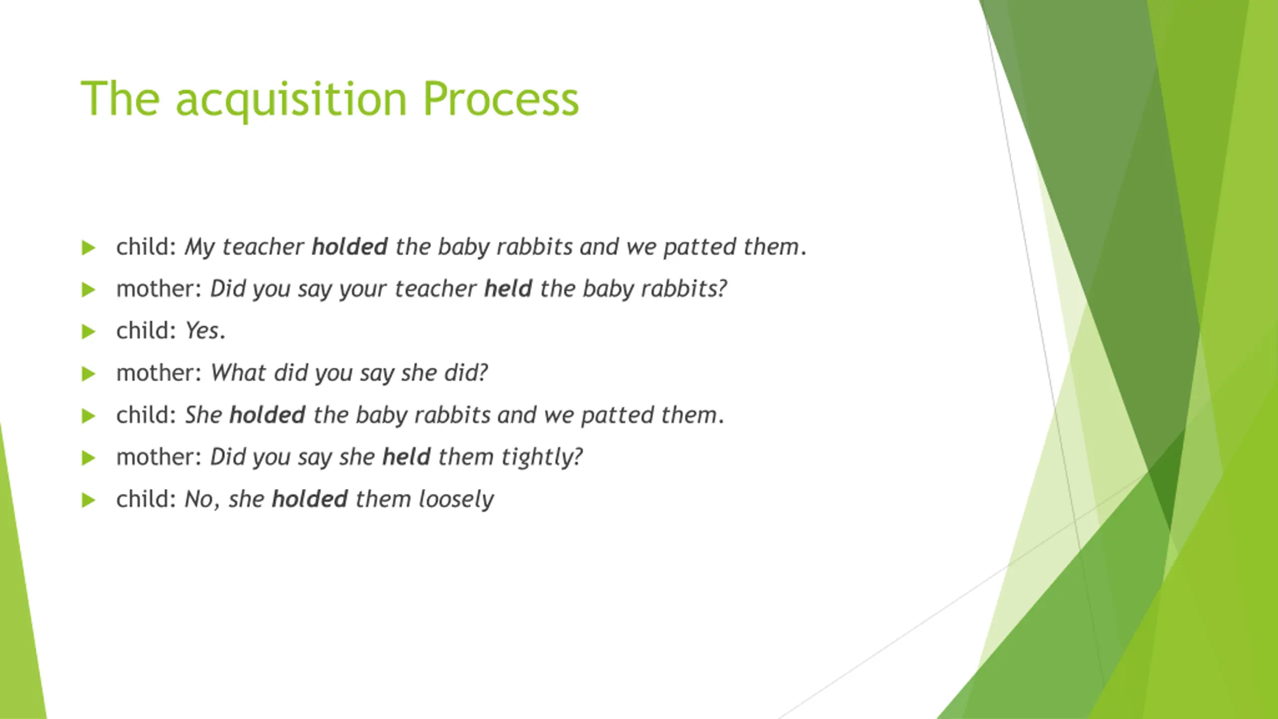 The acquisition Process child: My teacher holded the baby rabbits and we patted them. mother: Did you say your teacher held the baby rabbits? child: Yes. mother: What did you say she did? child: She holded the baby rabbits and we patted them. mother: Did you say she held them tightly? child: No, she holded them loosely