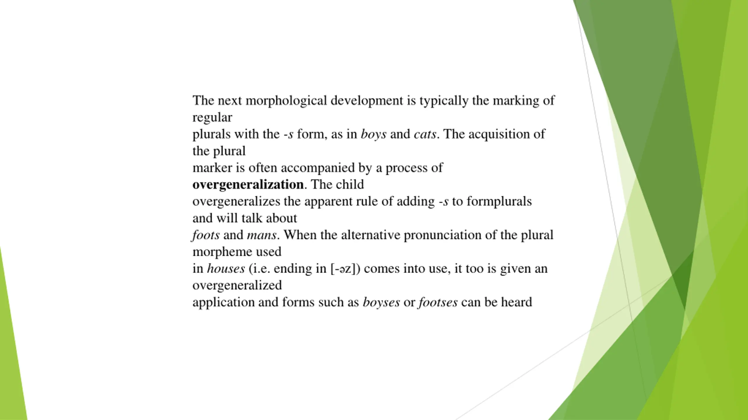 The next morphological development is typically the marking of regular plurals with the -s form, as in boys and cats. The acquisition of the plural marker is often accompanied by a process of overgeneralization. The child overgeneralizes the apparent rule of adding -s to formplurals and will talk about foots and mans. When the alternative pronunciation of the plural morpheme used in houses (i.e. ending in [- z]) comes into use, it too is given an overgeneralized application and forms such as boyses or footses can be heard
