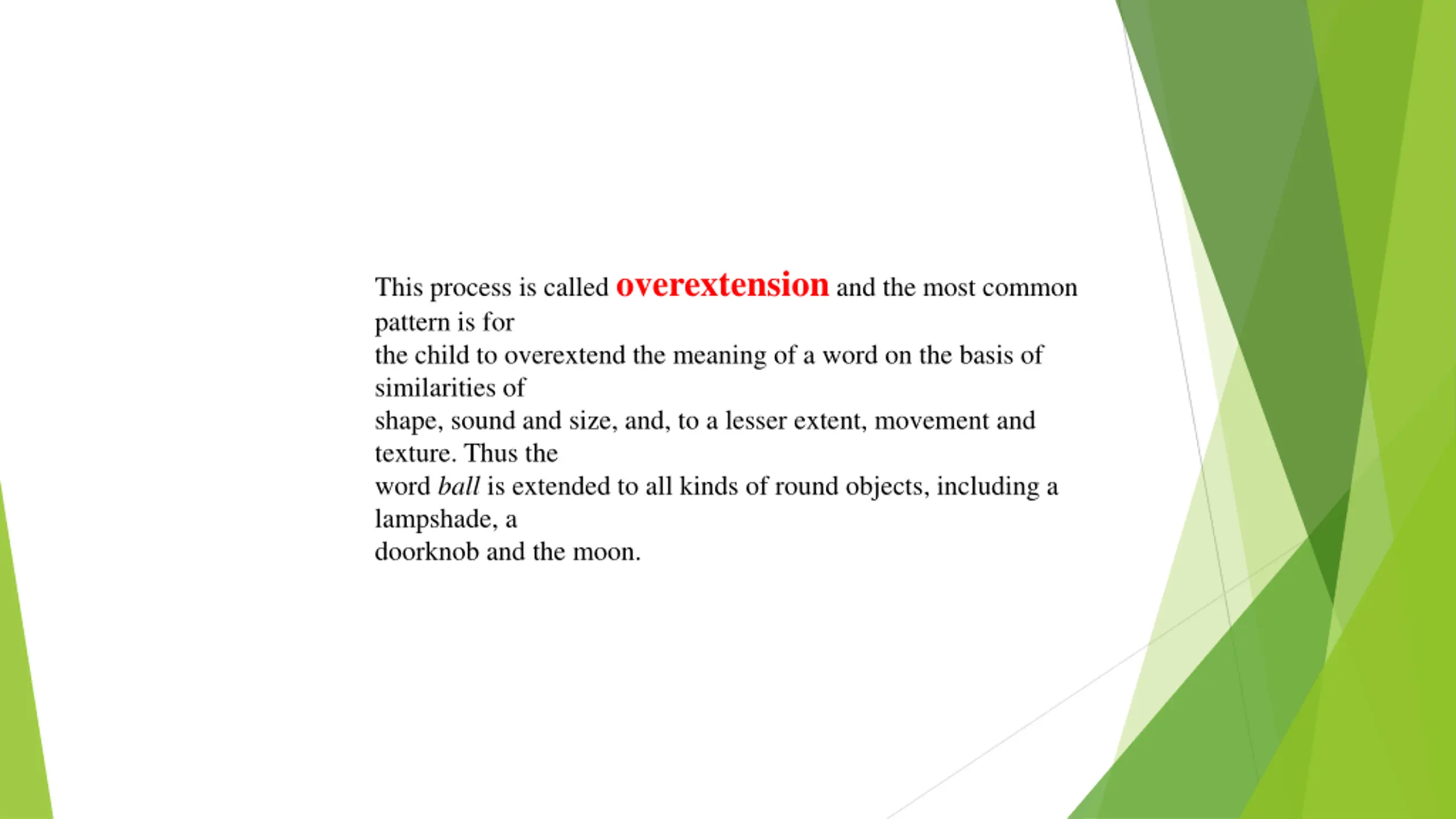 This process is called overextensionand the most common pattern is for the child to overextend the meaning of a word on the basis of similarities of shape, sound and size, and, to a lesser extent, movement and texture. Thus the word ball is extended to all kinds of round objects, including a lampshade, a doorknob and the moon.