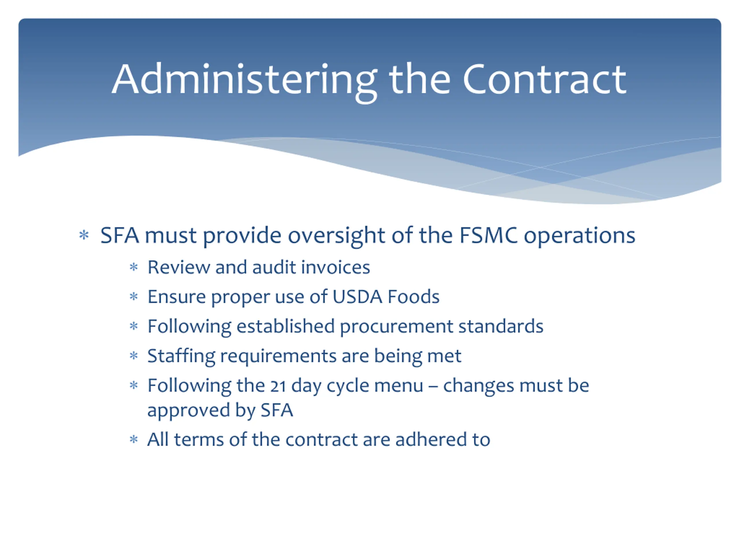 Administering the Contract SFA must provide oversight of the FSMC operations Review and audit invoices Ensure proper use of USDA Foods Following established procurement standards Staffing requirements are being met Following the 21 day cycle menu changes must be approved by SFA All terms of the contract are adhered to