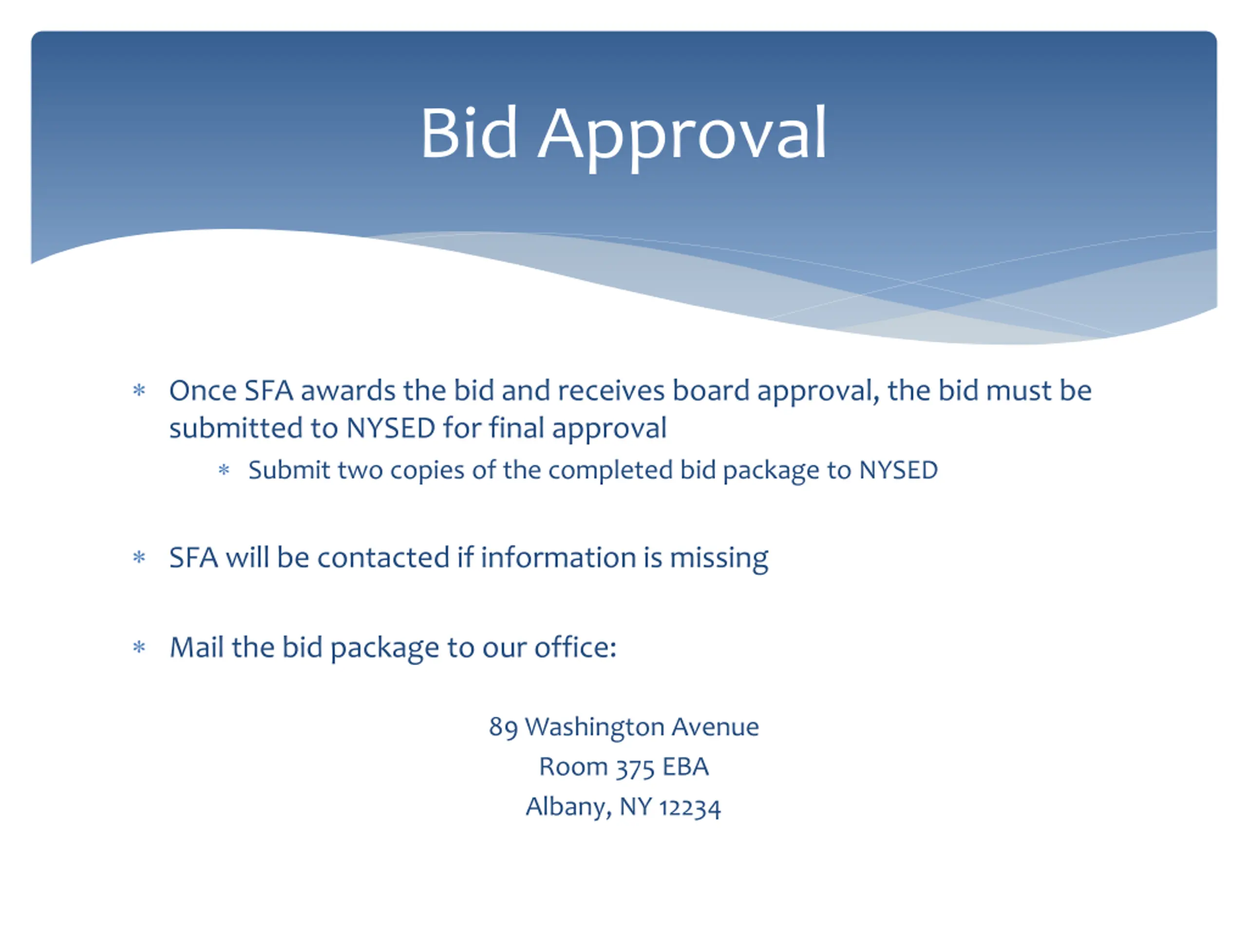 Bid Approval Once SFA awards the bid and receives board approval, the bid must be submitted to NYSED for final approval Submit two copies of the completed bid package to NYSED SFA will be contacted if information is missing Mail the bid package to our office: 89 Washington Avenue Room 375 EBA Albany, NY 12234