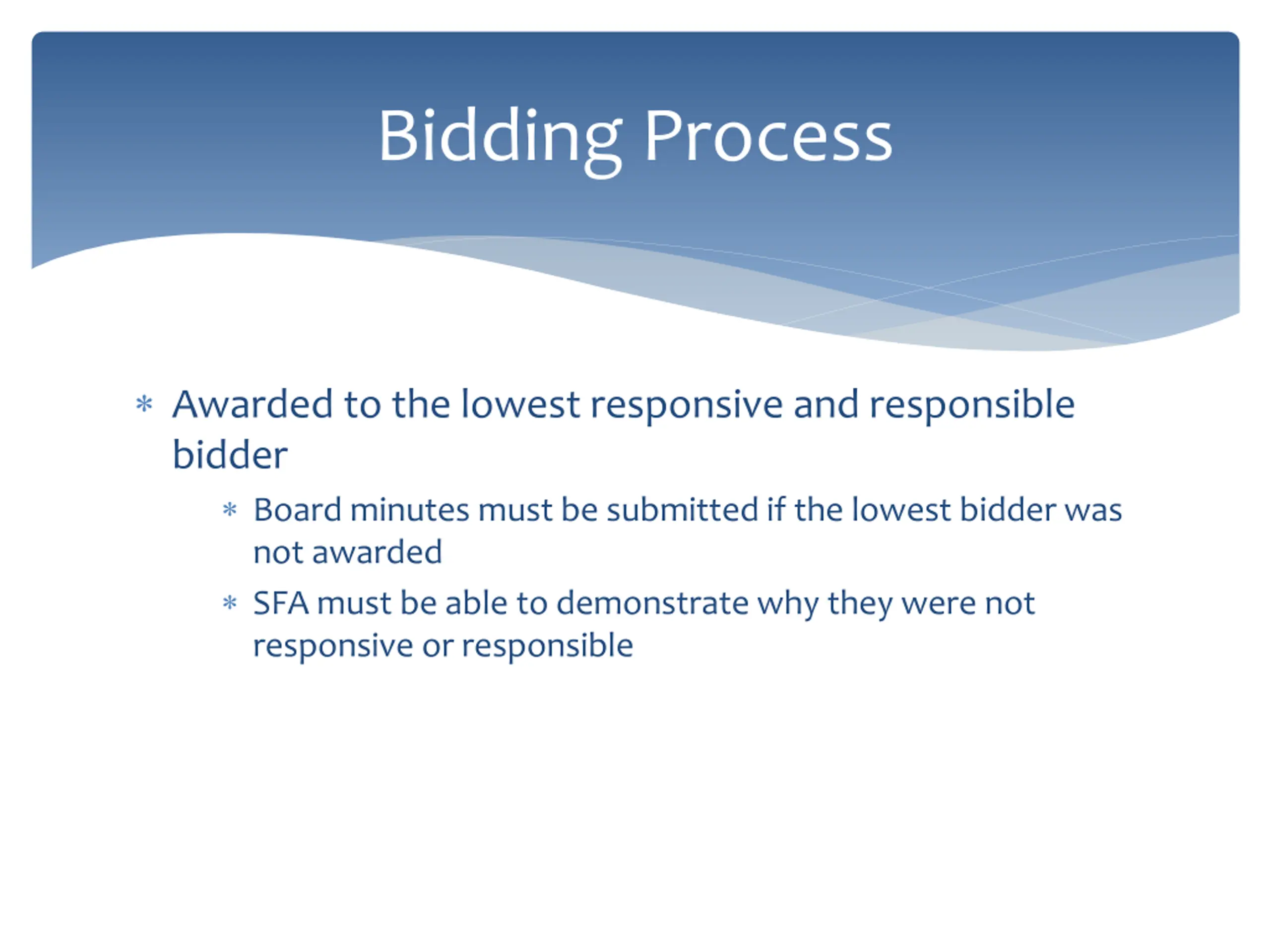 Bidding Process Awarded to the lowest responsive and responsible bidder Board minutes must be submitted if the lowest bidder was not awarded SFA must be able to demonstrate why they were not responsive or responsible