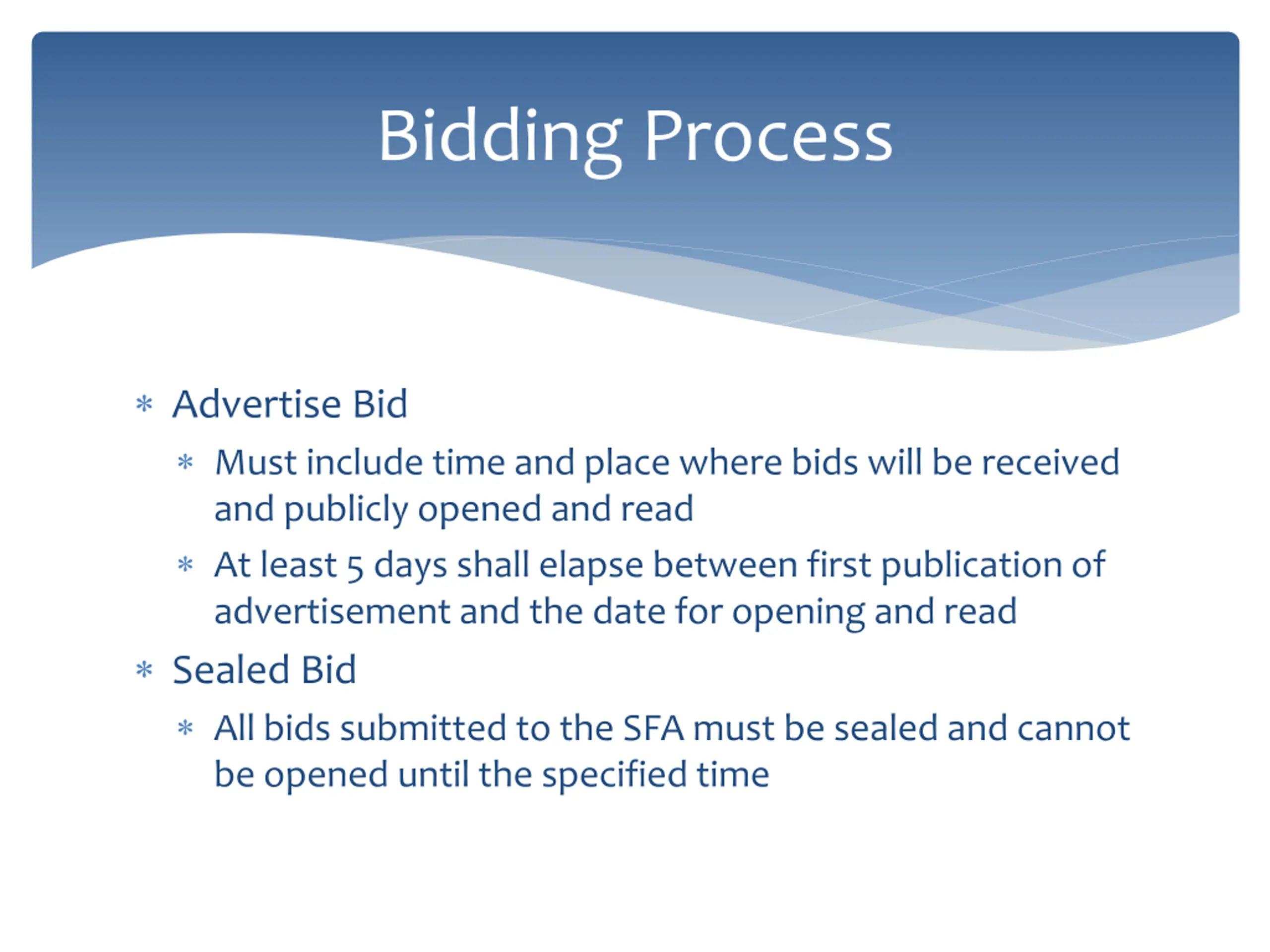Bidding Process Advertise Bid Must include time and place where bids will be received and publicly opened and read At least 5 days shall elapse between first publication of advertisement and the date for opening and read Sealed Bid All bids submitted to the SFA must be sealed and cannot be opened until the specified time