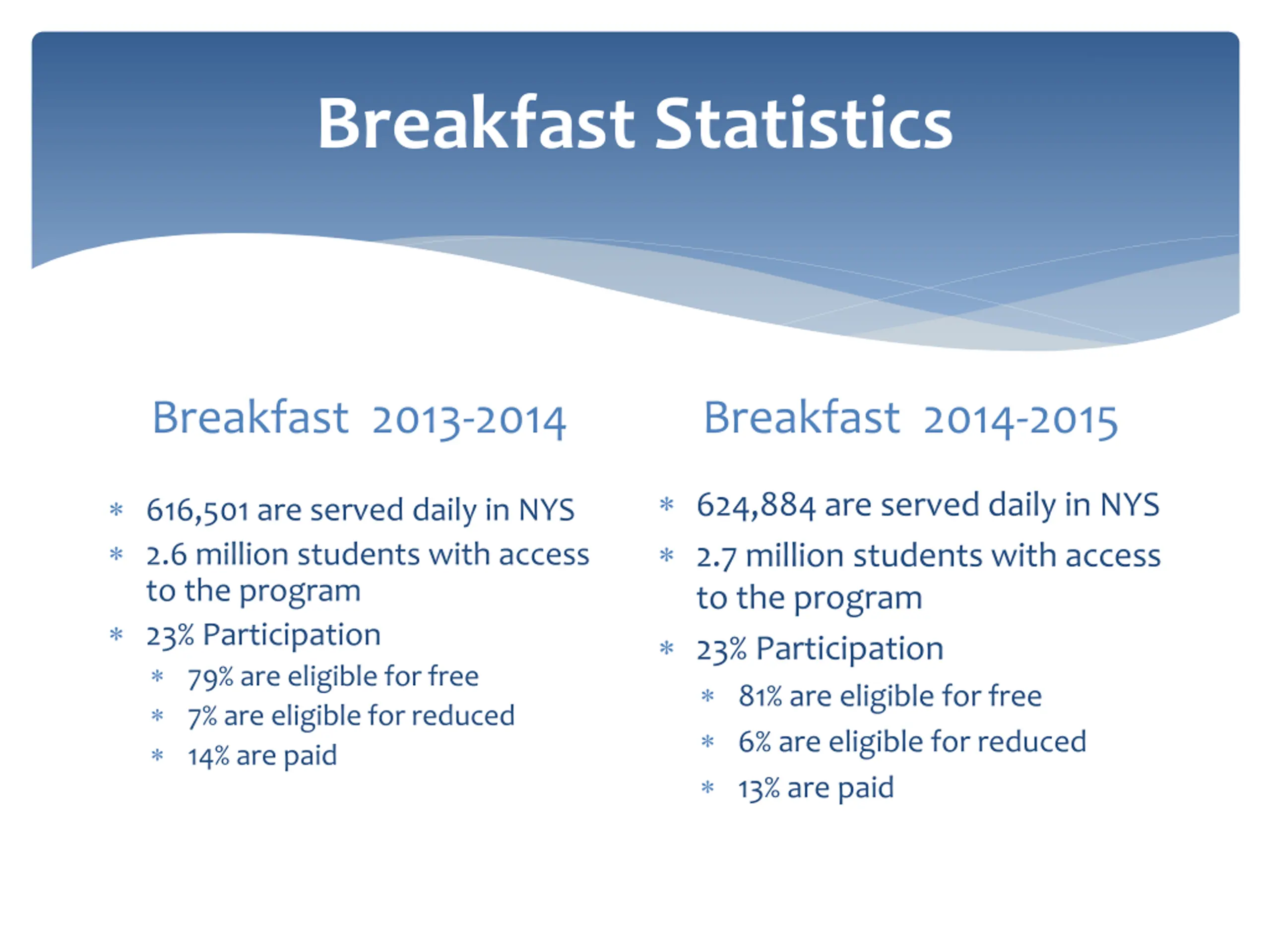 Breakfast Statistics Breakfast 2013-2014 Breakfast 2014-2015 624,884 are served daily in NYS 2.7 million students with access to the program 23% Participation 81% are eligible for free 6% are eligible for reduced 13% are paid 616,501 are served daily in NYS 2.6 million students with access to the program 23% Participation 79% are eligible for free 7% are eligible for reduced 14% are paid
