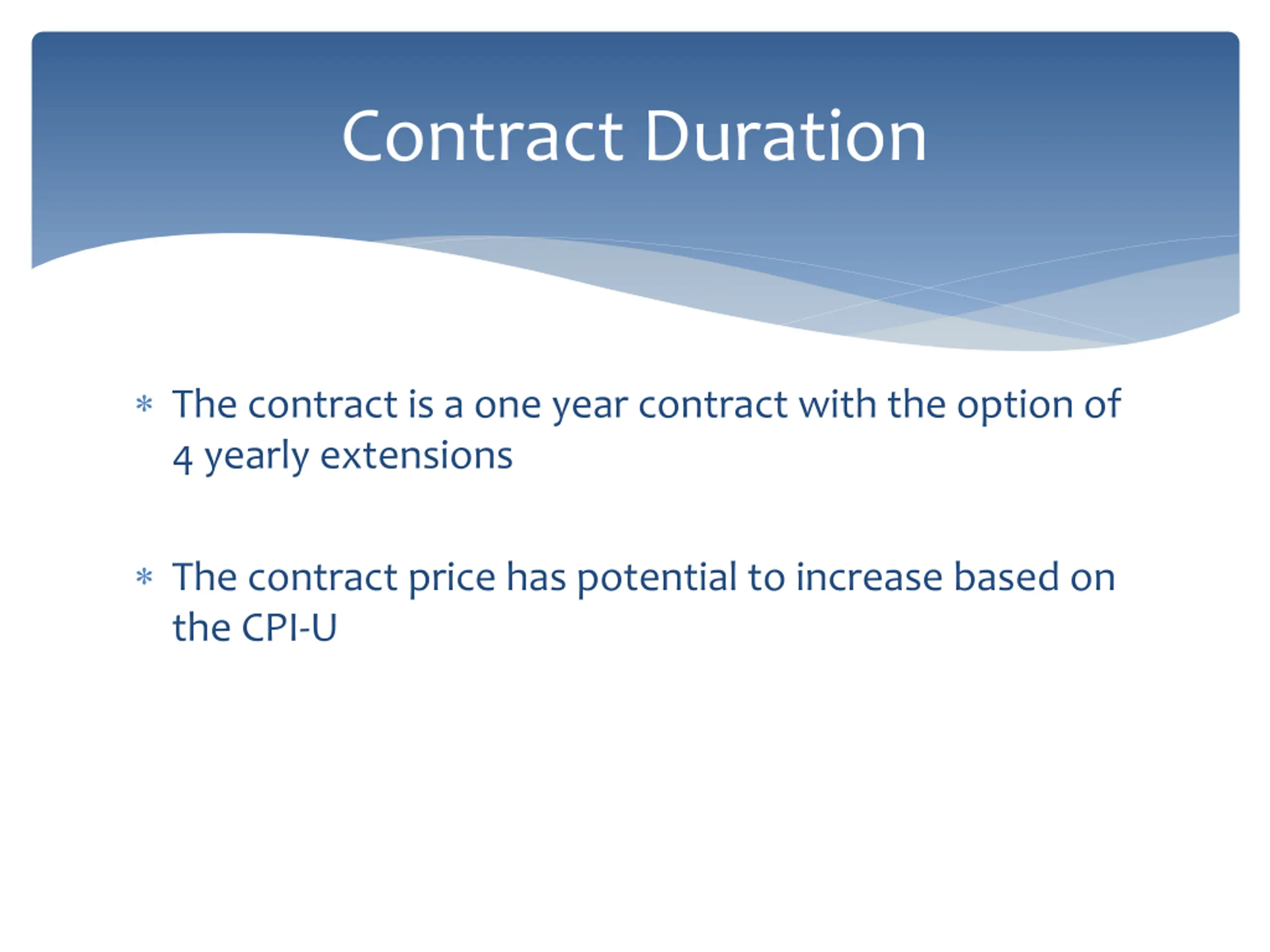 Contract Duration The contract is a one year contract with the option of 4 yearly extensions The contract price has potential to increase based on the CPI-U