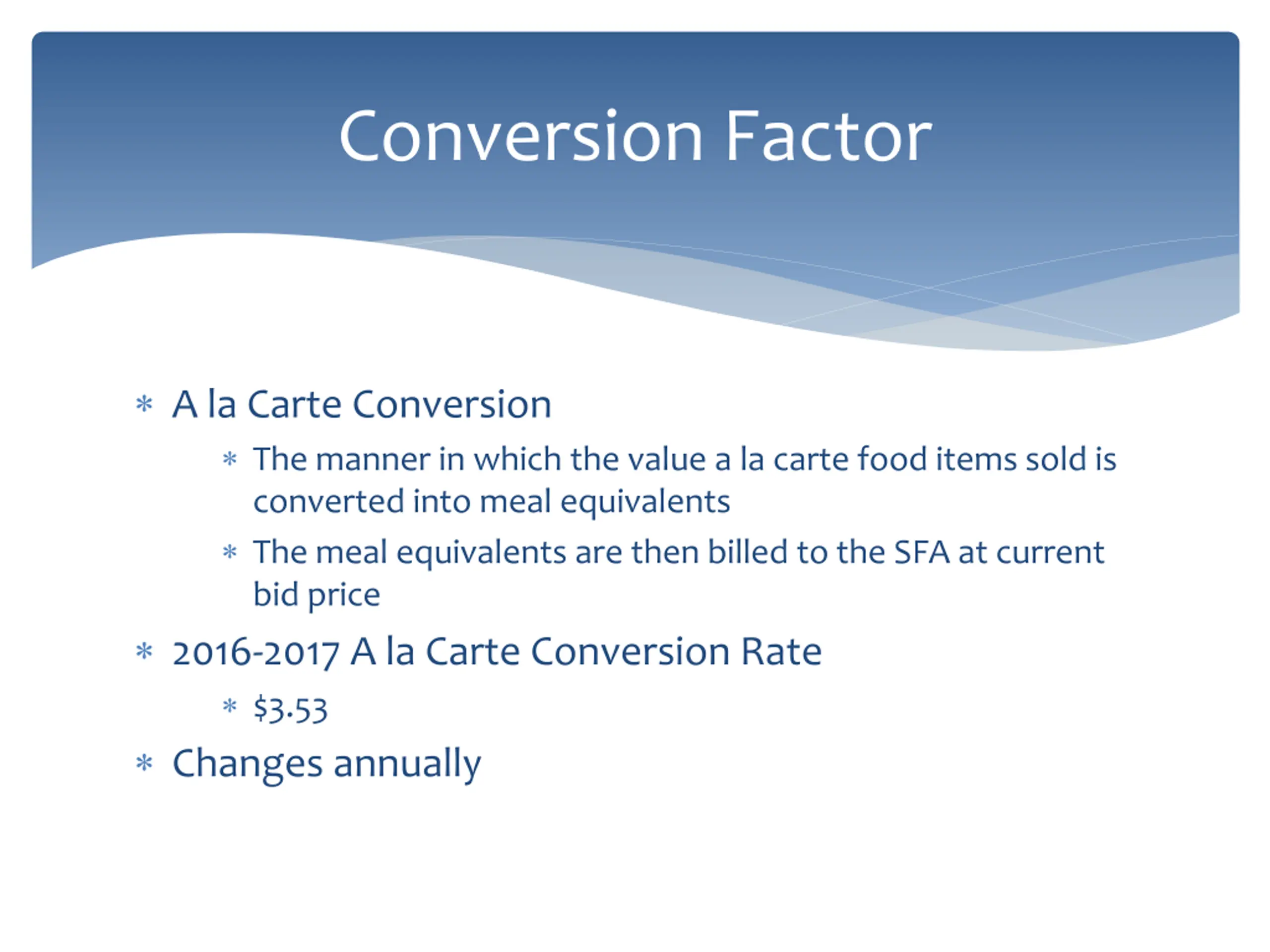 Conversion Factor A la Carte Conversion The manner in which the value a la carte food items sold is converted into meal equivalents The meal equivalents are then billed to the SFA at current bid price 2016-2017 A la Carte Conversion Rate $3.53 Changes annually