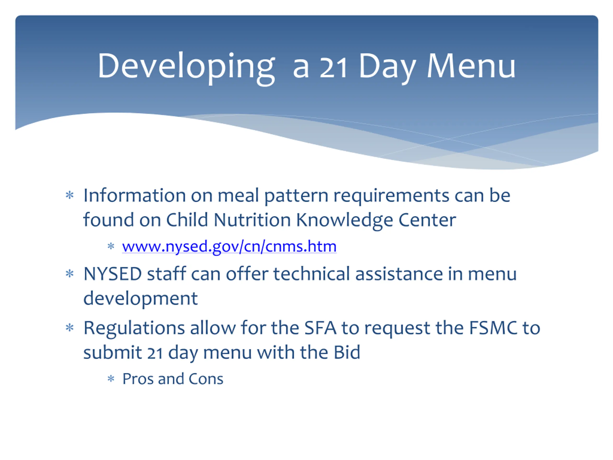 Developing a 21 Day Menu Information on meal pattern requirements can be found on Child Nutrition Knowledge Center www.nysed.gov/cn/cnms.htm NYSED staff can offer technical assistance in menu development Regulations allow for the SFA to request the FSMC to submit 21 day menu with the Bid Pros and Cons