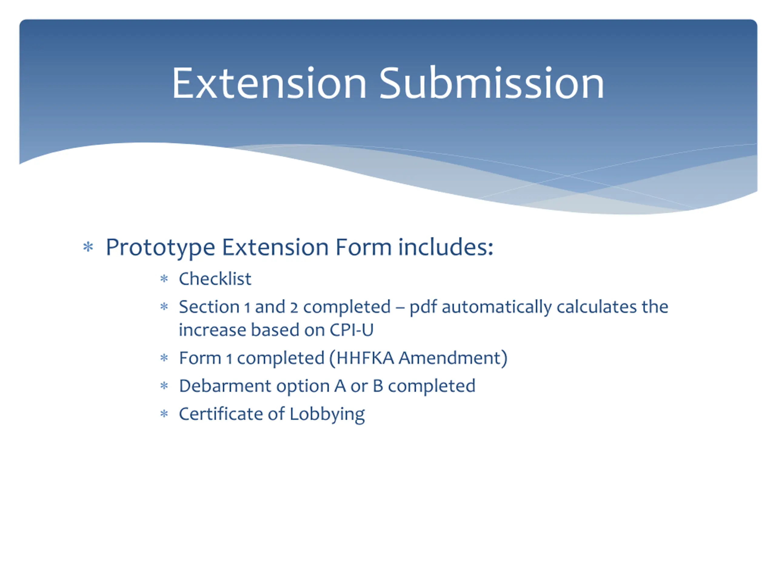 Extension Submission Prototype Extension Form includes: Checklist Section 1 and 2 completed pdf automatically calculates the increase based on CPI-U Form 1 completed (HHFKA Amendment) Debarment option A or B completed Certificate of Lobbying