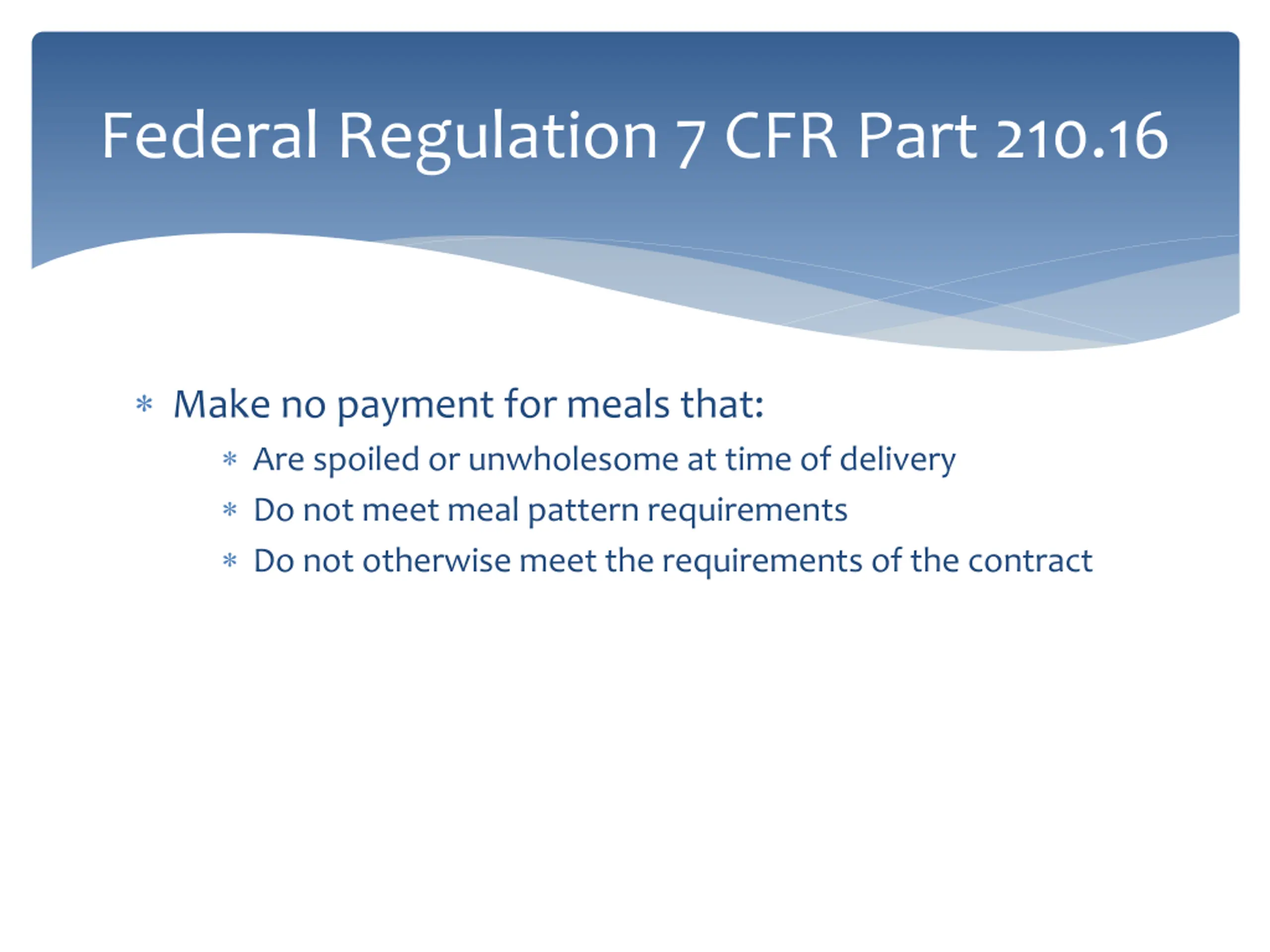 Federal Regulation 7 CFR Part 210.16 Make no payment for meals that: Are spoiled or unwholesome at time of delivery Do not meet meal pattern requirements Do not otherwise meet the requirements of the contract