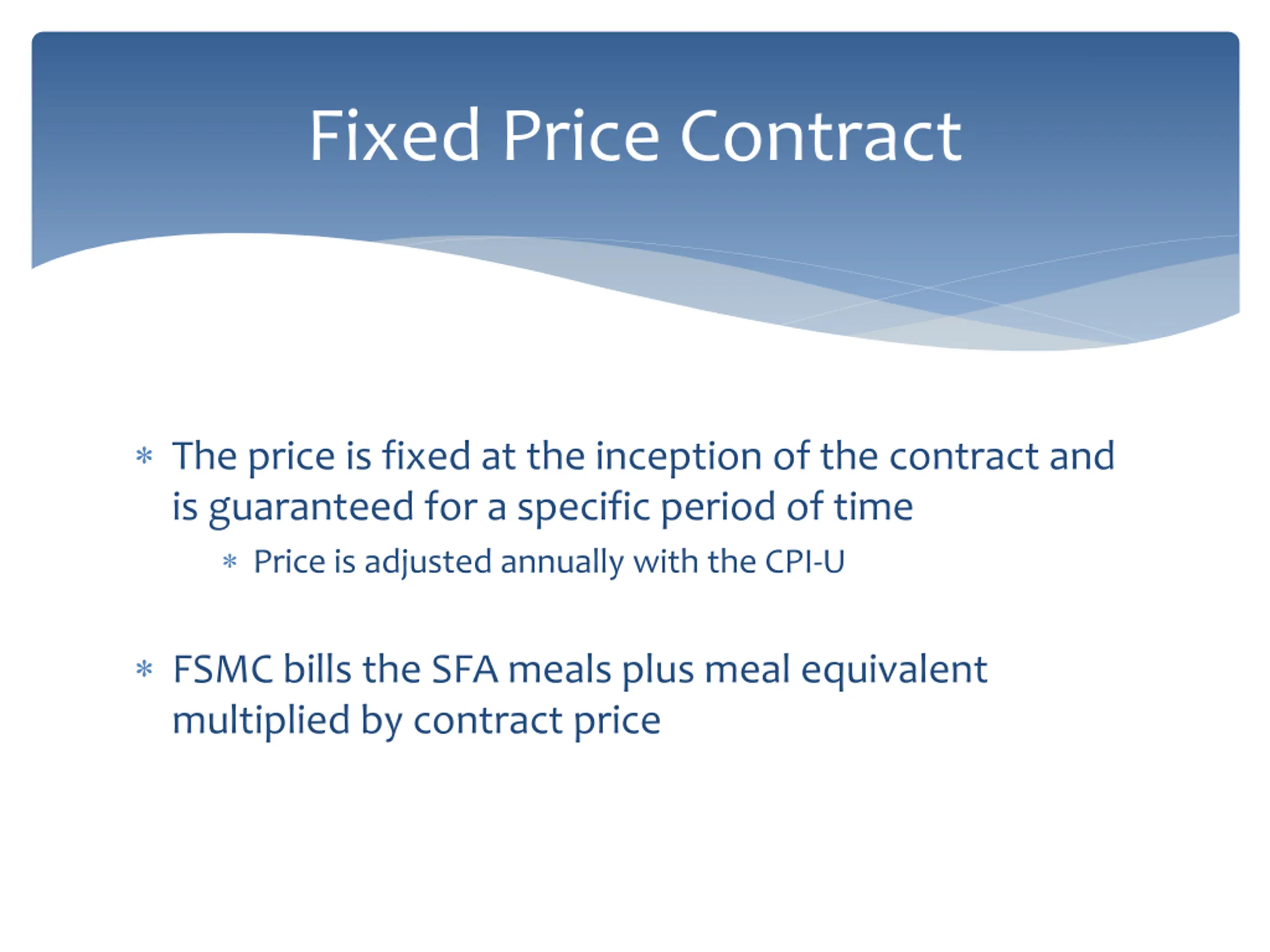 Fixed Price Contract The price is fixed at the inception of the contract and is guaranteed for a specific period of time Price is adjusted annually with the CPI-U FSMC bills the SFA meals plus meal equivalent multiplied by contract price