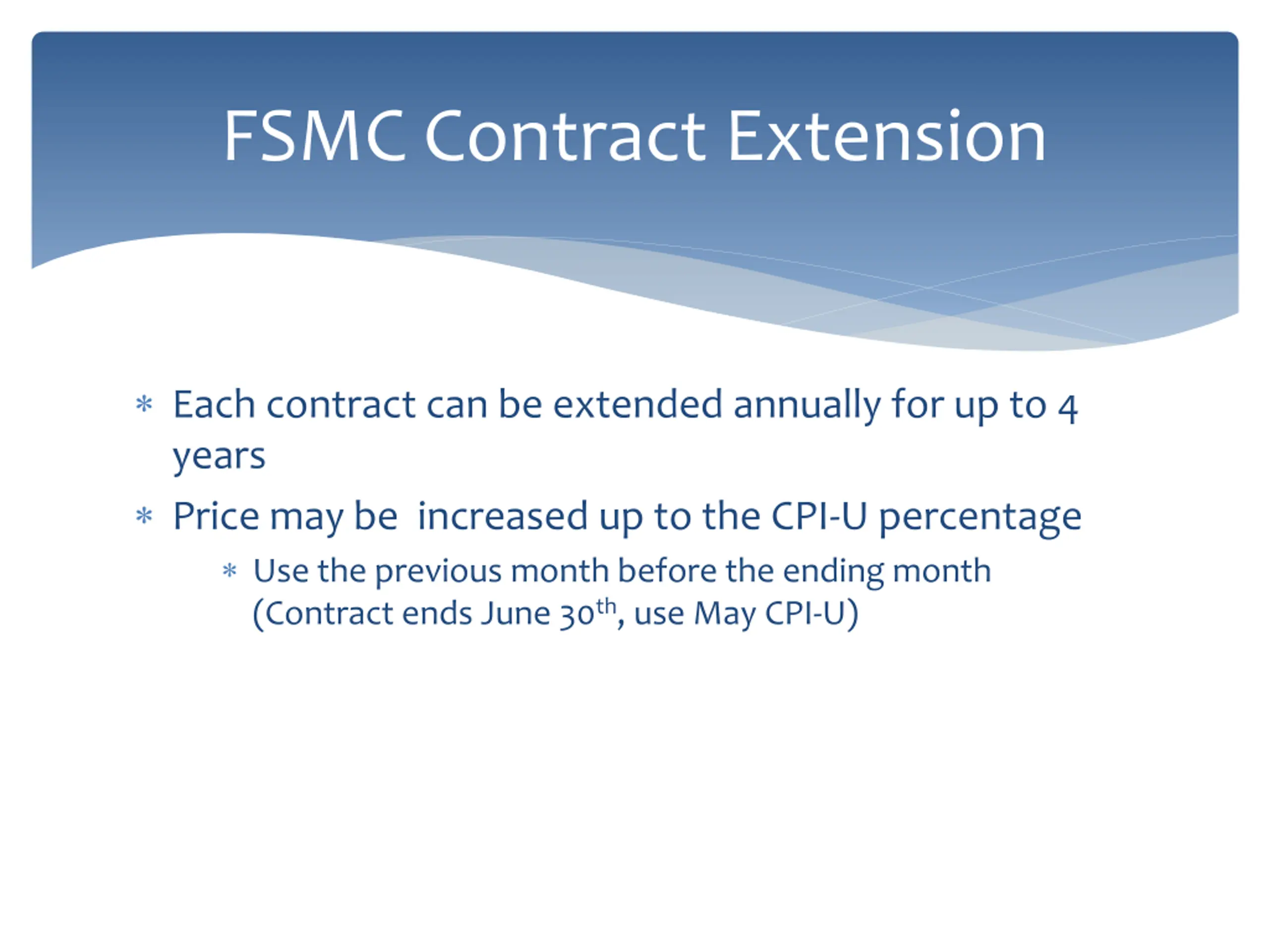 FSMC Contract Extension Each contract can be extended annually for up to 4 years Price may be increased up to the CPI-U percentage Use the previous month before the ending month (Contract ends June 30th, use May CPI-U)