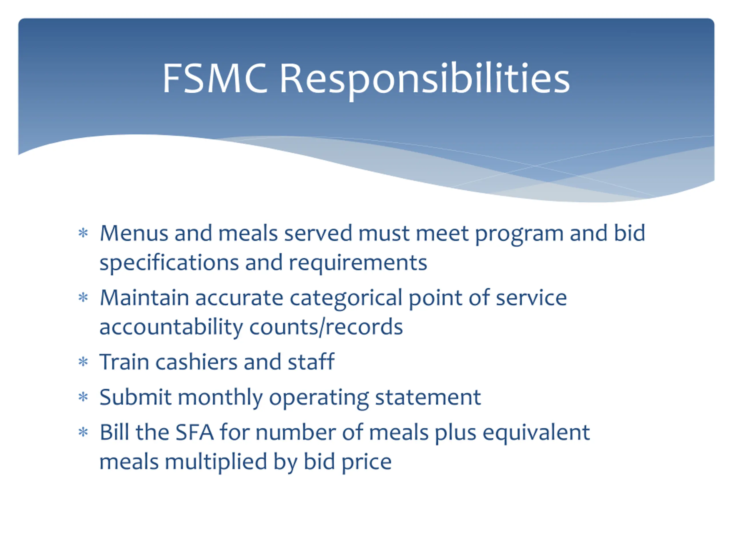 FSMC Responsibilities Menus and meals served must meet program and bid specifications and requirements Maintain accurate categorical point of service accountability counts/records Train cashiers and staff Submit monthly operating statement Bill the SFA for number of meals plus equivalent meals multiplied by bid price