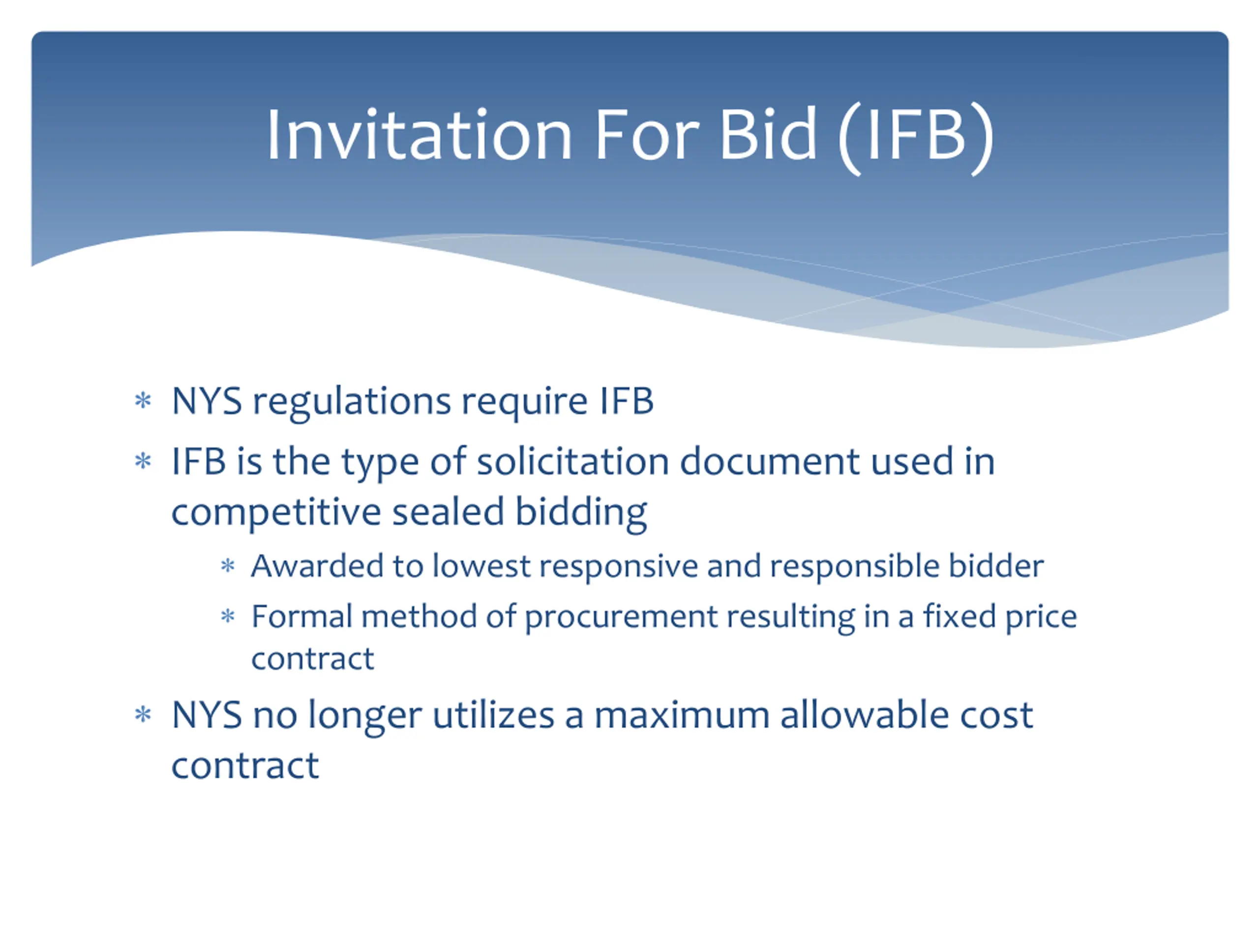 Invitation For Bid (IFB) NYS regulations require IFB IFB is the type of solicitation document used in competitive sealed bidding Awarded to lowest responsive and responsible bidder Formal method of procurement resulting in a fixed price contract NYS no longer utilizes a maximum allowable cost contract