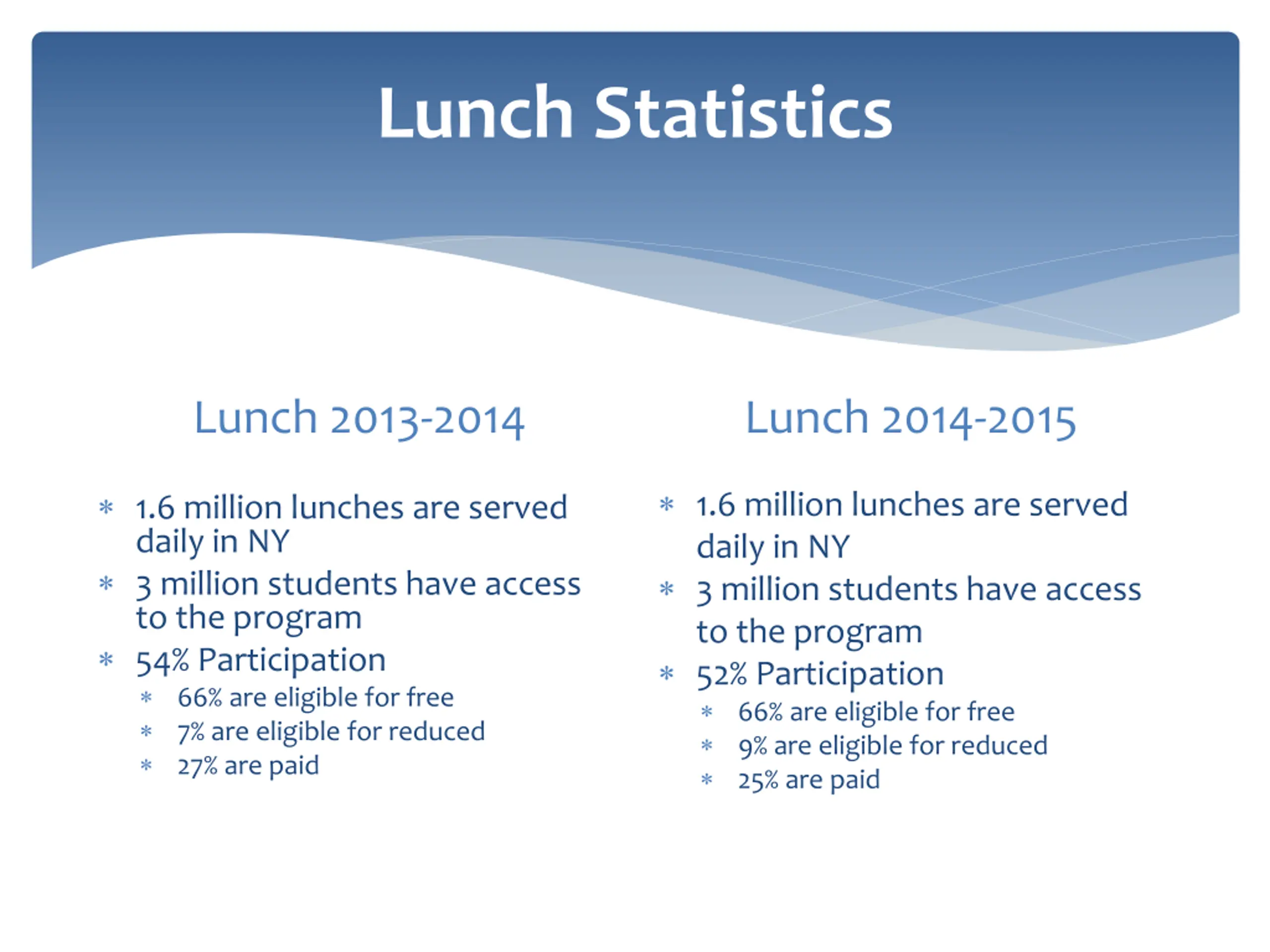 Lunch Statistics Lunch 2013-2014 Lunch 2014-2015 1.6 million lunches are served daily in NY 3 million students have access to the program 52% Participation 66% are eligible for free 9% are eligible for reduced 25% are paid 1.6 million lunches are served daily in NY 3 million students have access to the program 54% Participation 66% are eligible for free 7% are eligible for reduced 27% are paid