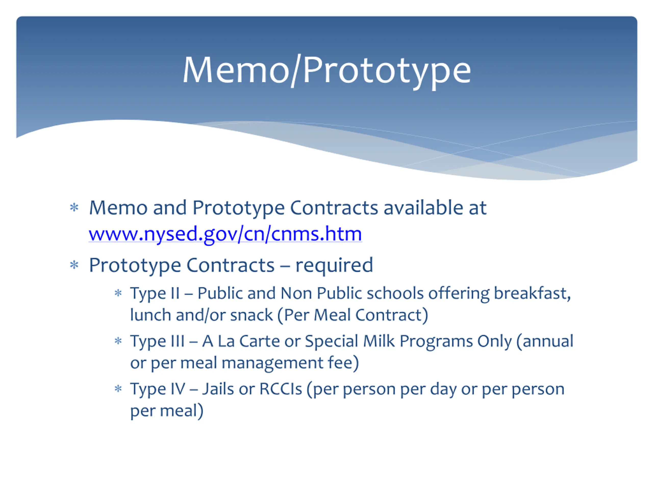 Memo/Prototype Memo and Prototype Contracts available at www.nysed.gov/cn/cnms.htm Prototype Contracts required Type II Public and Non Public schools offering breakfast, lunch and/or snack (Per Meal Contract) Type III A La Carte or Special Milk Programs Only (annual or per meal management fee) Type IV Jails or RCCIs (per person per day or per person per meal)