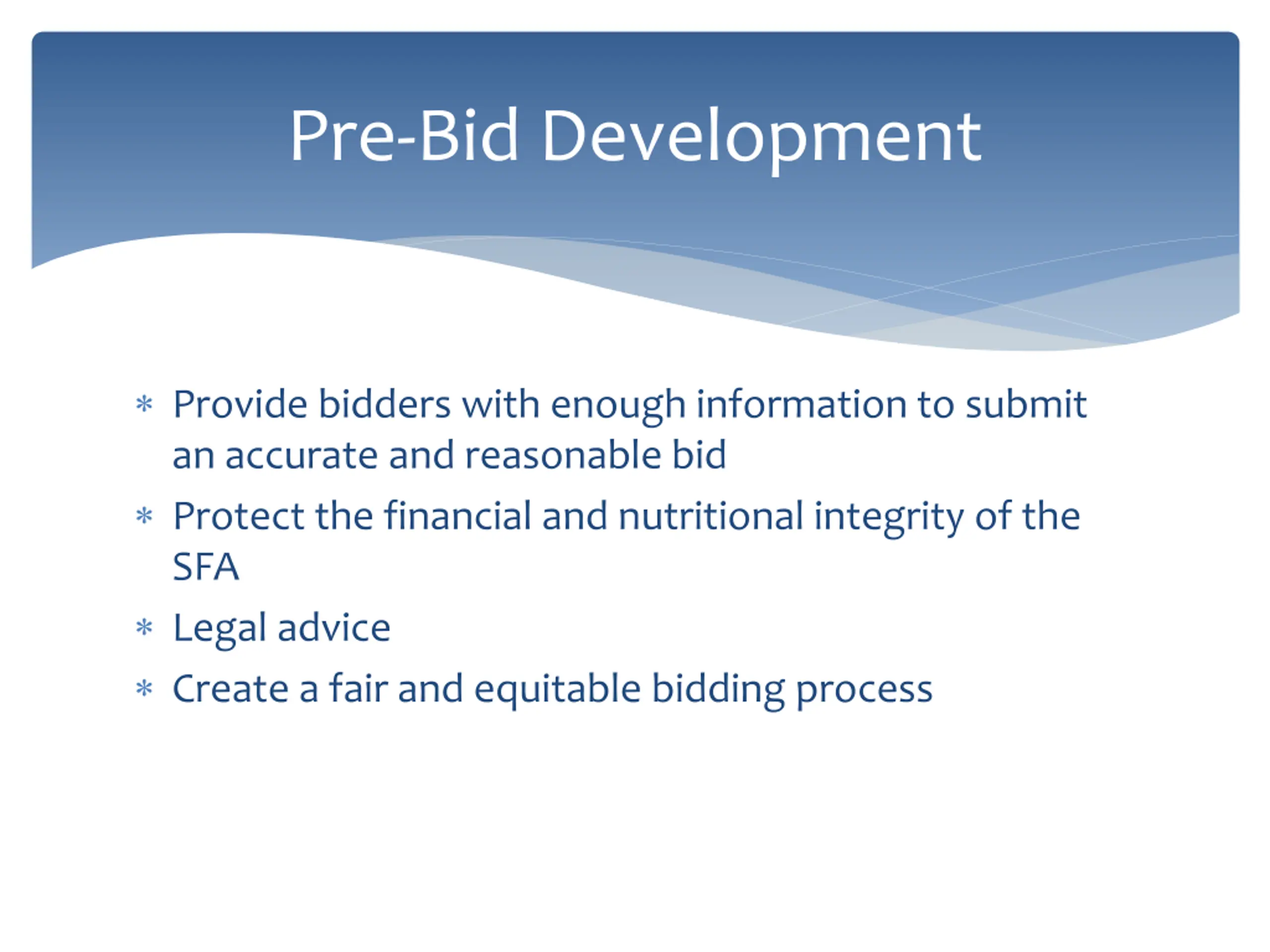 Pre-Bid Development Provide bidders with enough information to submit an accurate and reasonable bid Protect the financial and nutritional integrity of the SFA Legal advice Create a fair and equitable bidding process