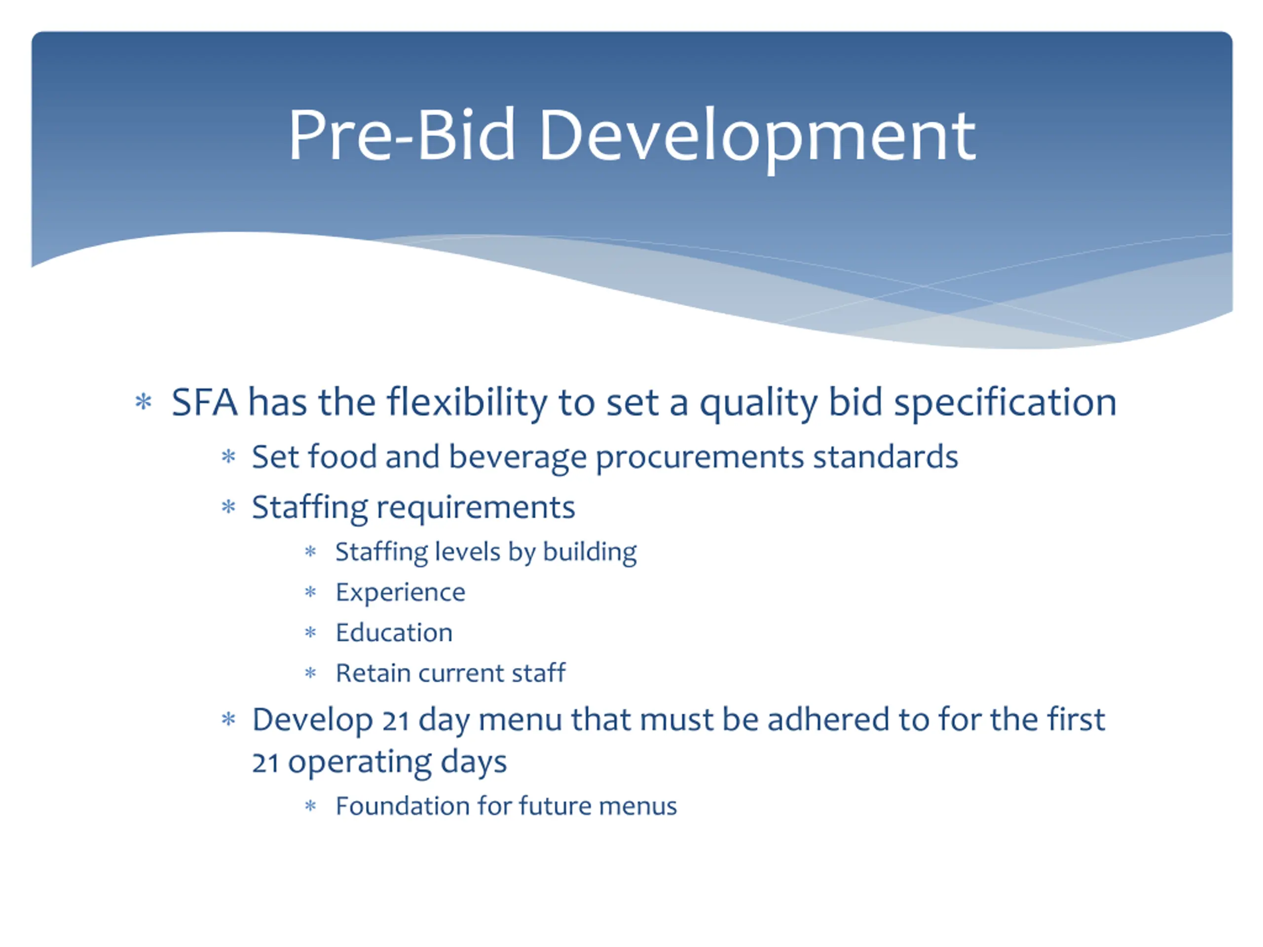 Pre-Bid Development SFA has the flexibility to set a quality bid specification Set food and beverage procurements standards Staffing requirements Staffing levels by building Experience Education Retain current staff Develop 21 day menu that must be adhered to for the first 21 operating days Foundation for future menus