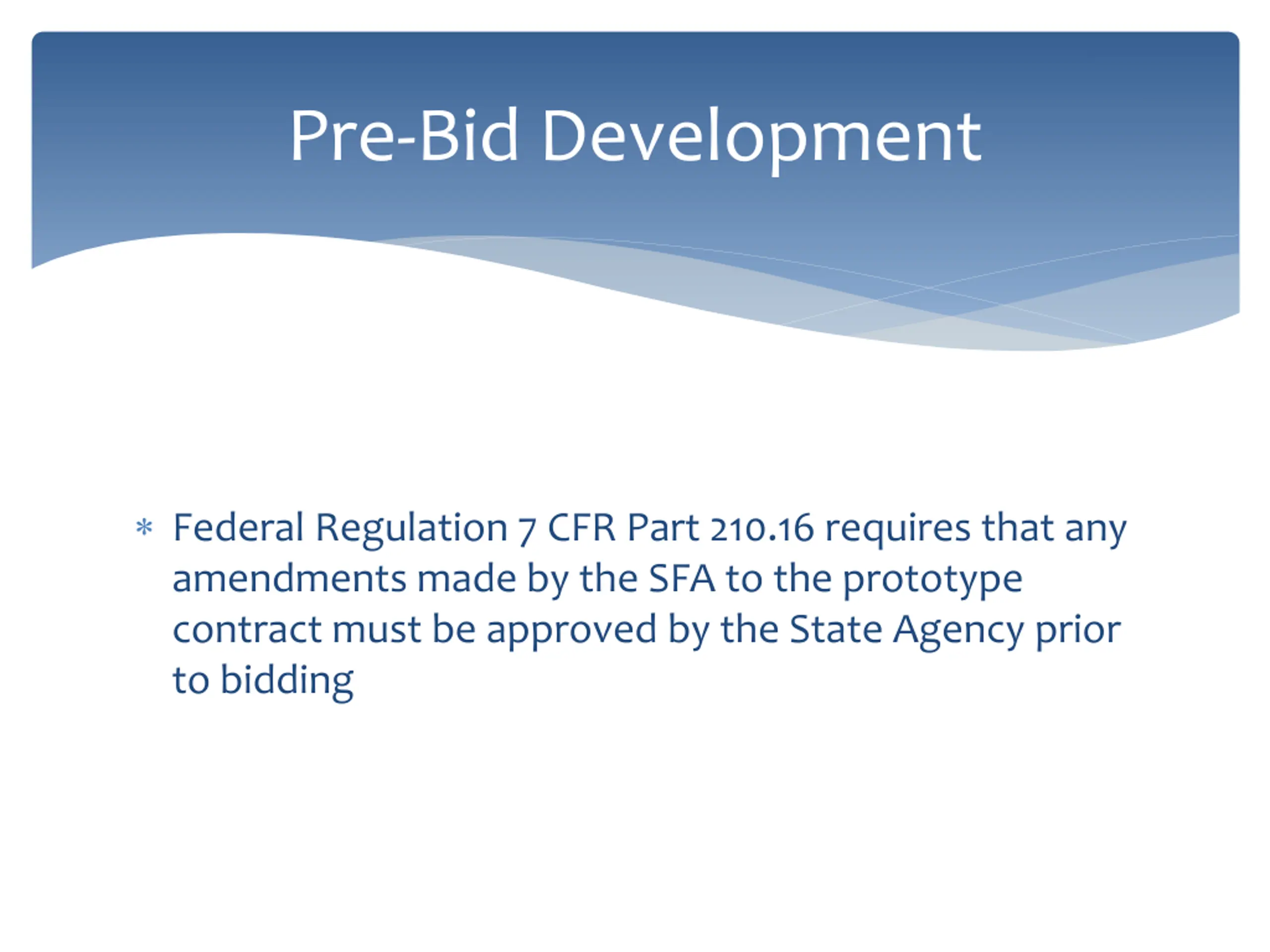 Pre-Bid Development Federal Regulation 7 CFR Part 210.16 requires that any amendments made by the SFA to the prototype contract must be approved by the State Agency prior to bidding