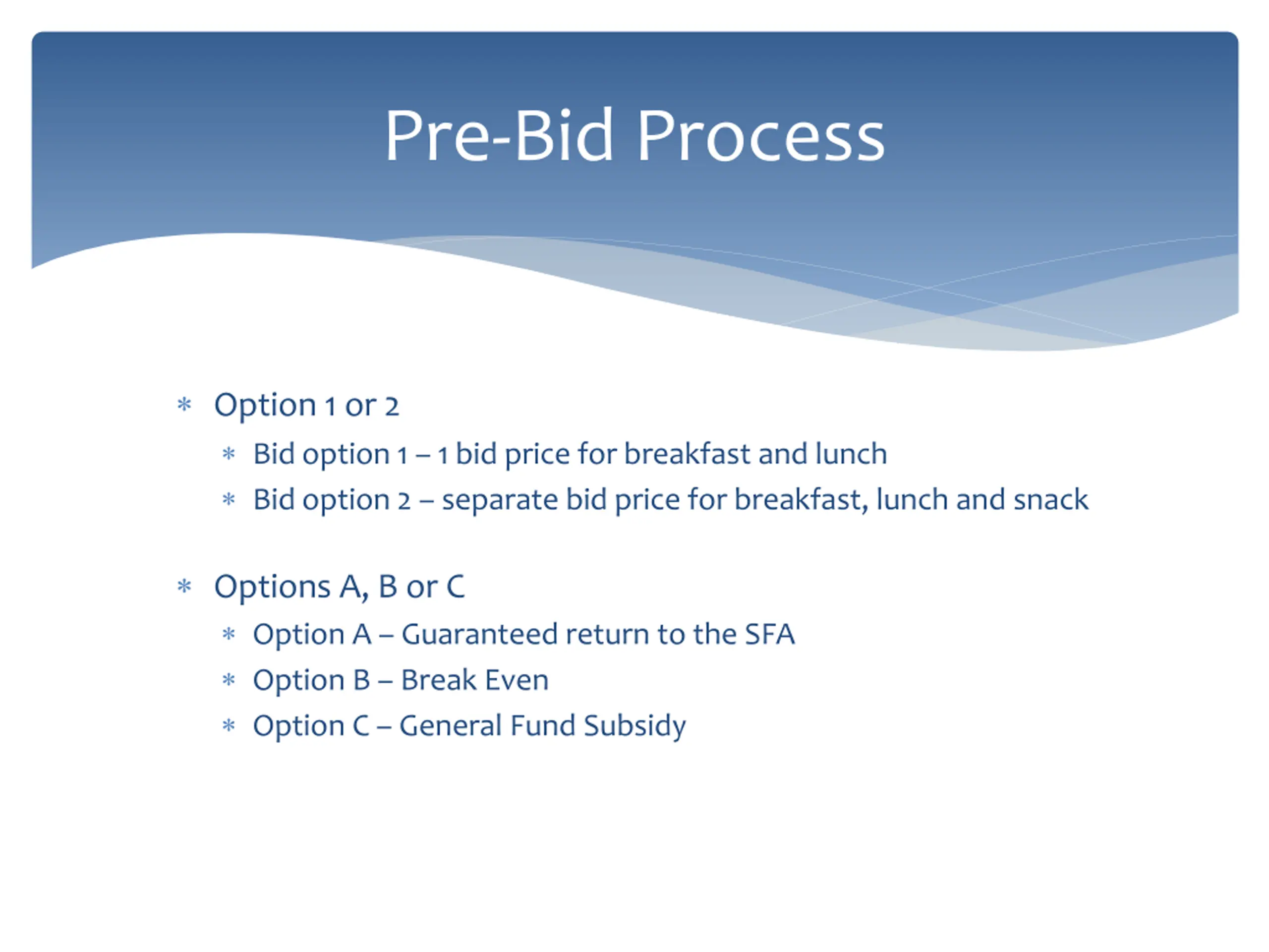 Pre-Bid Process Option 1 or 2 Bid option 1 1 bid price for breakfast and lunch Bid option 2 separate bid price for breakfast, lunch and snack Options A, B or C Option A Guaranteed return to the SFA Option B Break Even Option C General Fund Subsidy