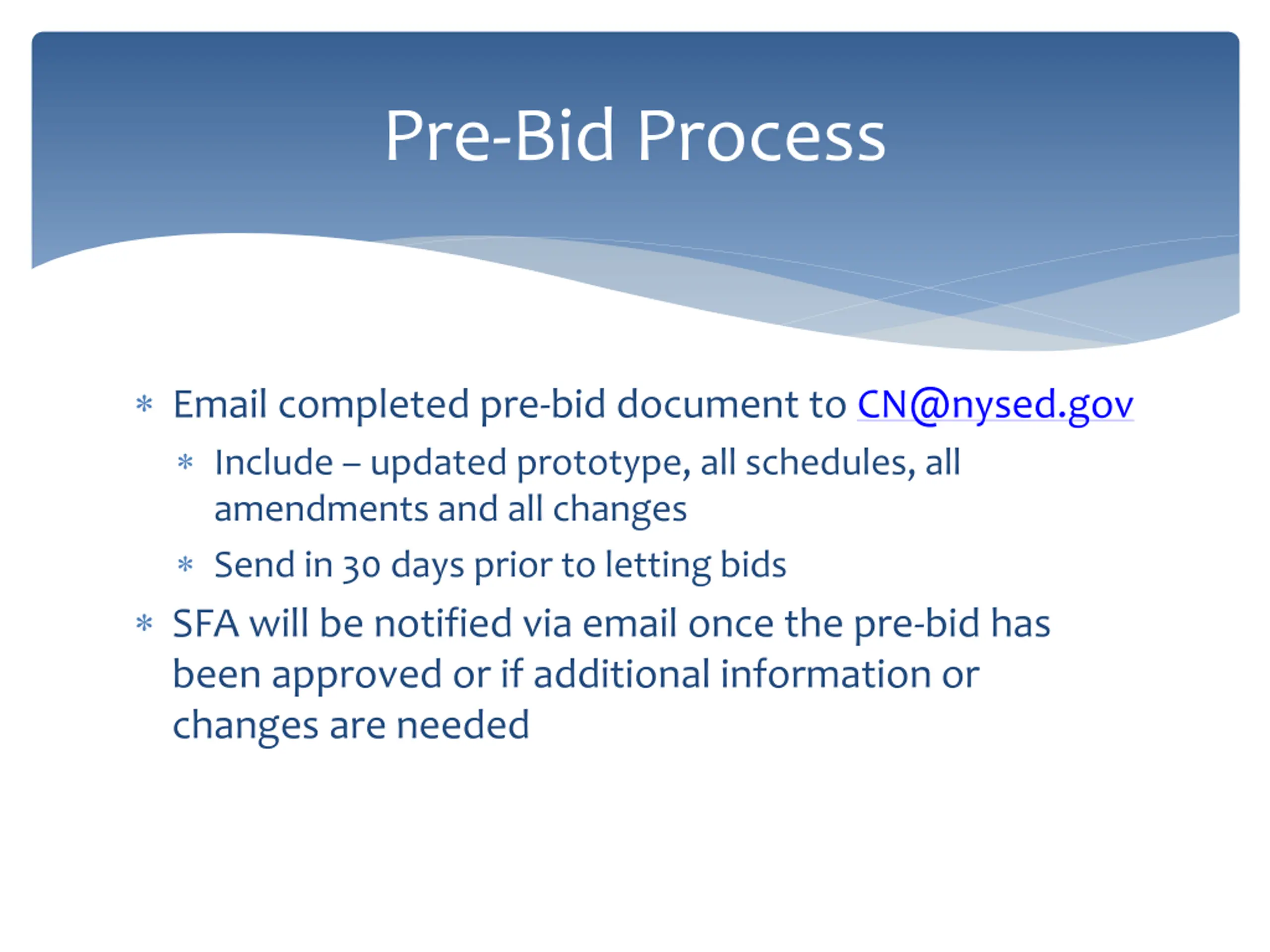 Pre-Bid Process Email completed pre-bid document to CN@nysed.gov Include updated prototype, all schedules, all amendments and all changes Send in 30 days prior to letting bids SFA will be notified via email once the pre-bid has been approved or if additional information or changes are needed
