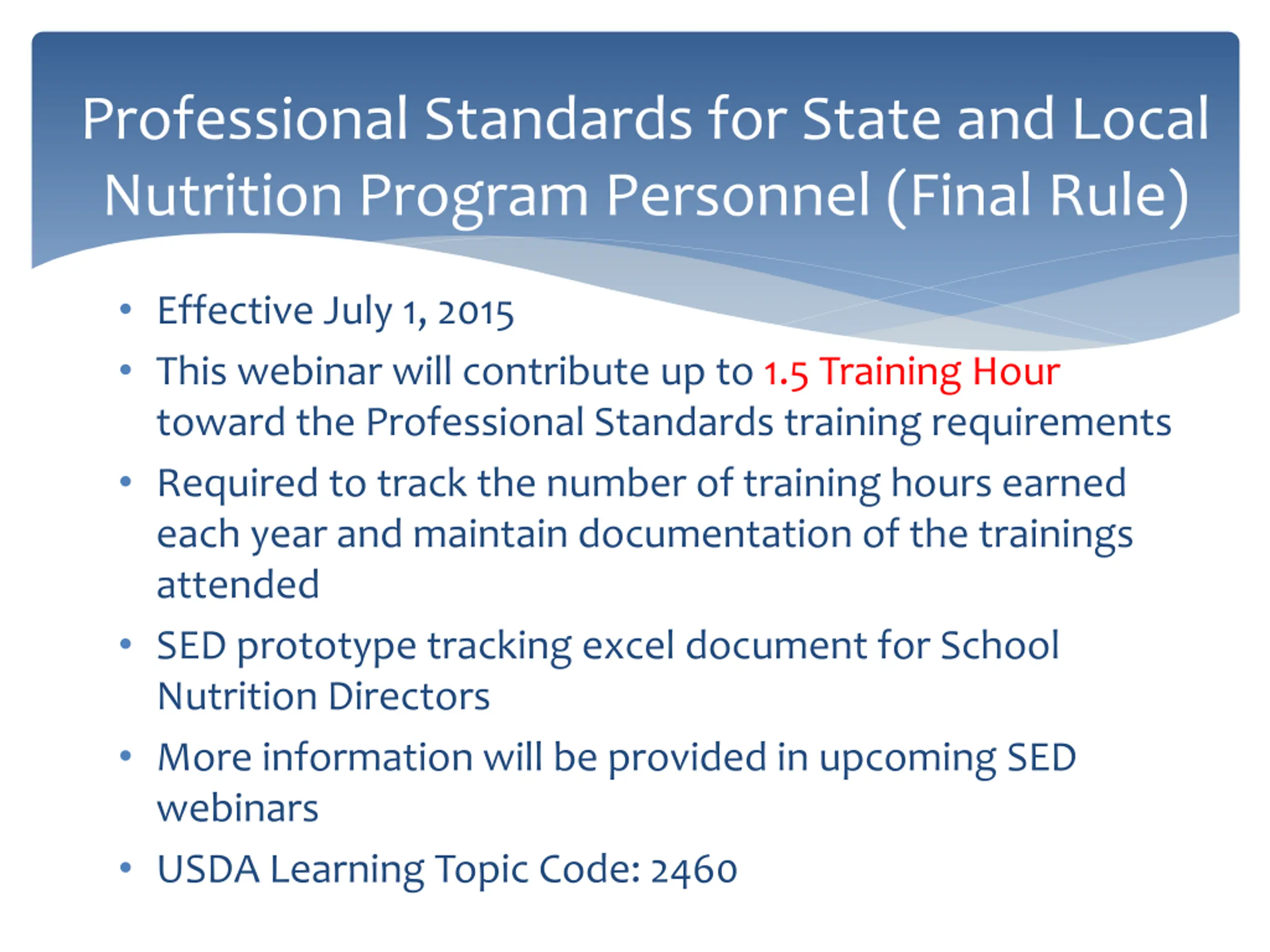 Professional Standards for State and Local Nutrition Program Personnel (Final Rule) Effective July 1, 2015 This webinar will contribute up to 1.5 Training Hour toward the Professional Standards training requirements Required to track the number of training hours earned each year and maintain documentation of the trainings attended SED prototype tracking excel document for School Nutrition Directors More information will be provided in upcoming SED webinars USDA Learning Topic Code: 2460