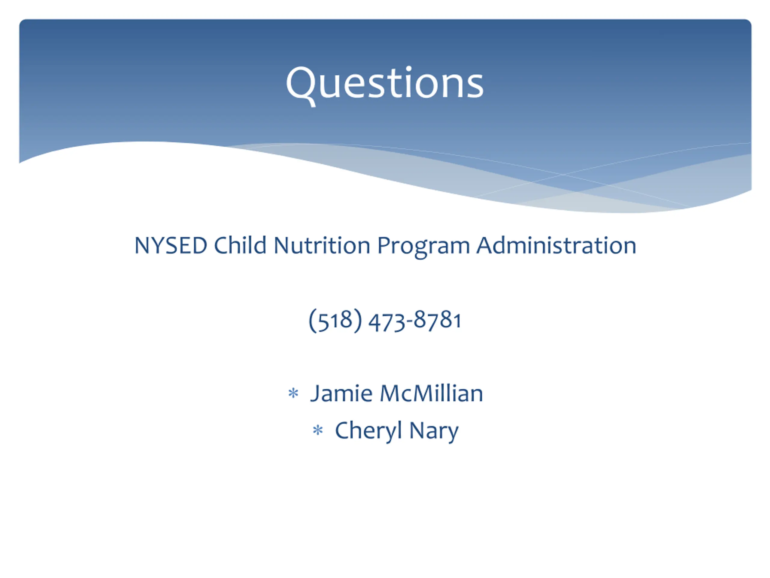 Questions NYSED Child Nutrition Program Administration (518) 473-8781 Jamie McMillian Cheryl Nary