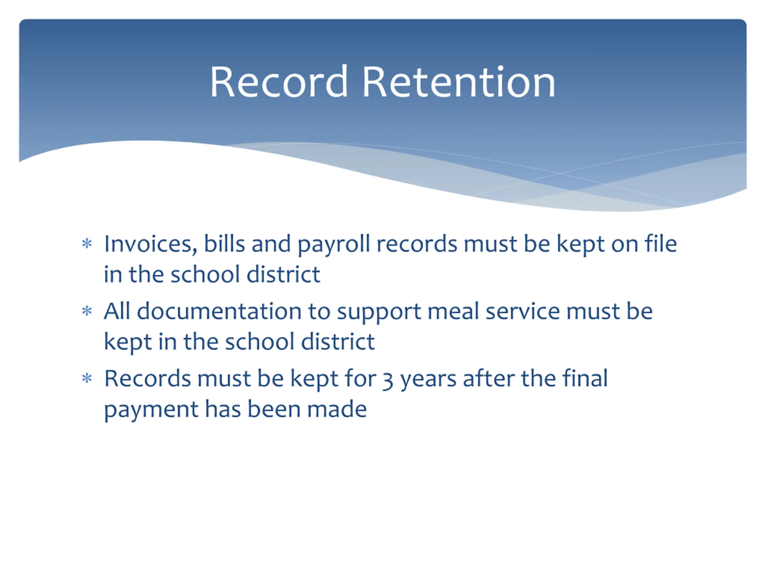 Record Retention Invoices, bills and payroll records must be kept on file in the school district All documentation to support meal service must be kept in the school district Records must be kept for 3 years after the final payment has been made