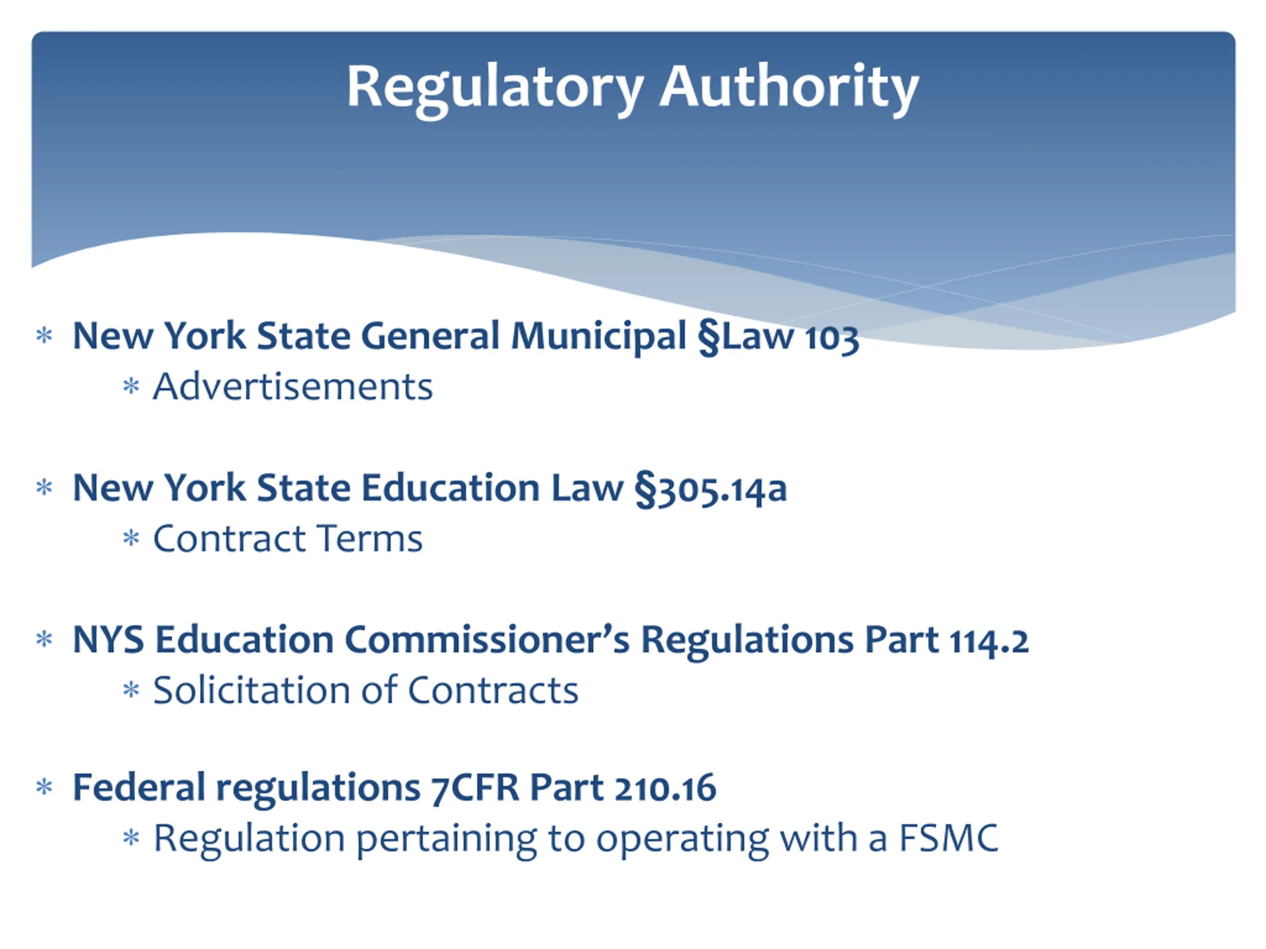 Regulatory Authority New York State General Municipal Law 103 Advertisements New York State Education Law 305.14a Contract Terms NYS Education Commissioner s Regulations Part 114.2 Solicitation of Contracts Federal regulations 7CFR Part 210.16 Regulation pertaining to operating with a FSMC
