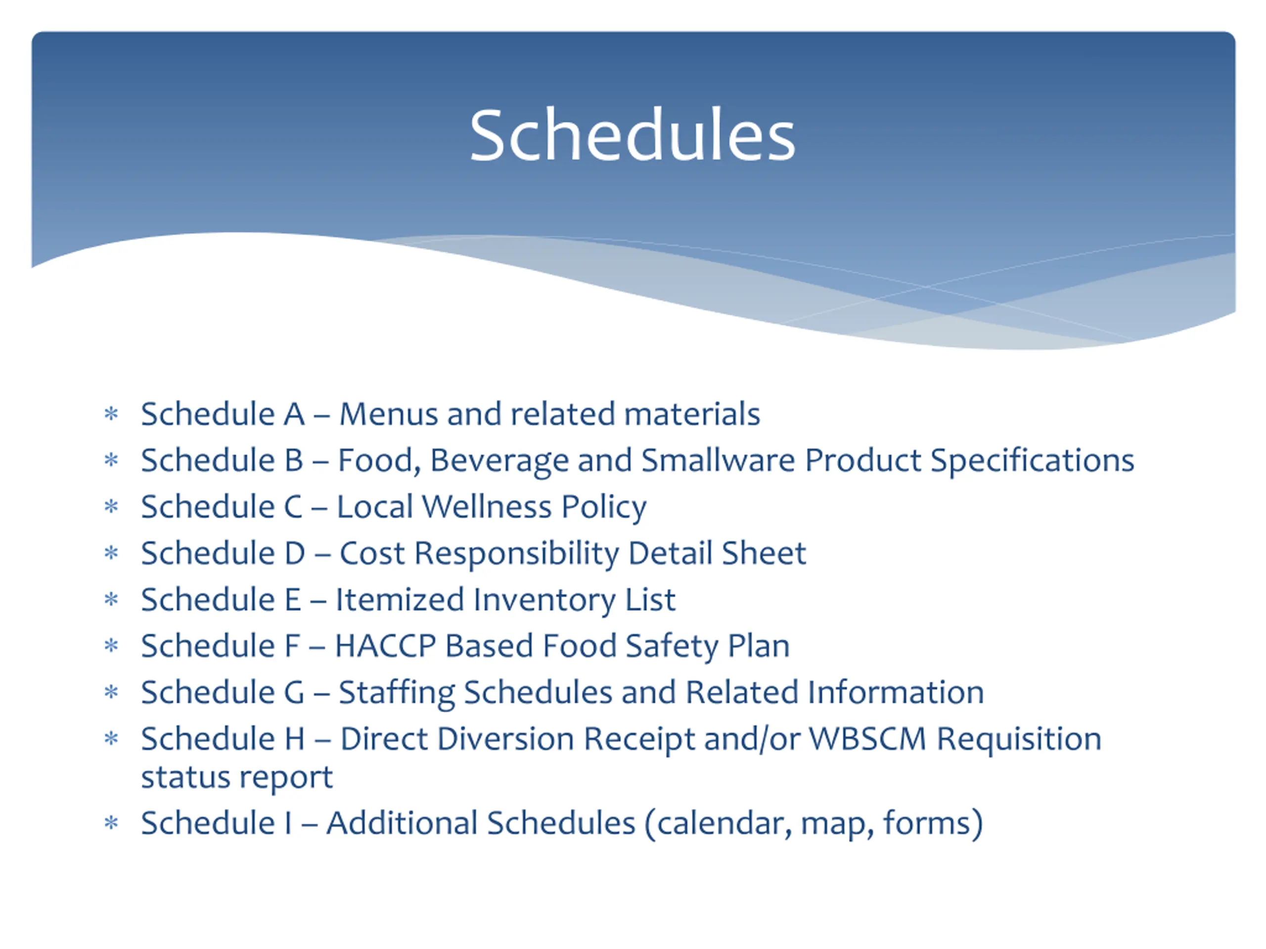 Schedules Schedule A Menus and related materials Schedule B Food, Beverage and Smallware Product Specifications Schedule C Local Wellness Policy Schedule D Cost Responsibility Detail Sheet Schedule E Itemized Inventory List Schedule F HACCP Based Food Safety Plan Schedule G Staffing Schedules and Related Information Schedule H Direct Diversion Receipt and/or WBSCM Requisition status report Schedule I Additional Schedules (calendar, map, forms)