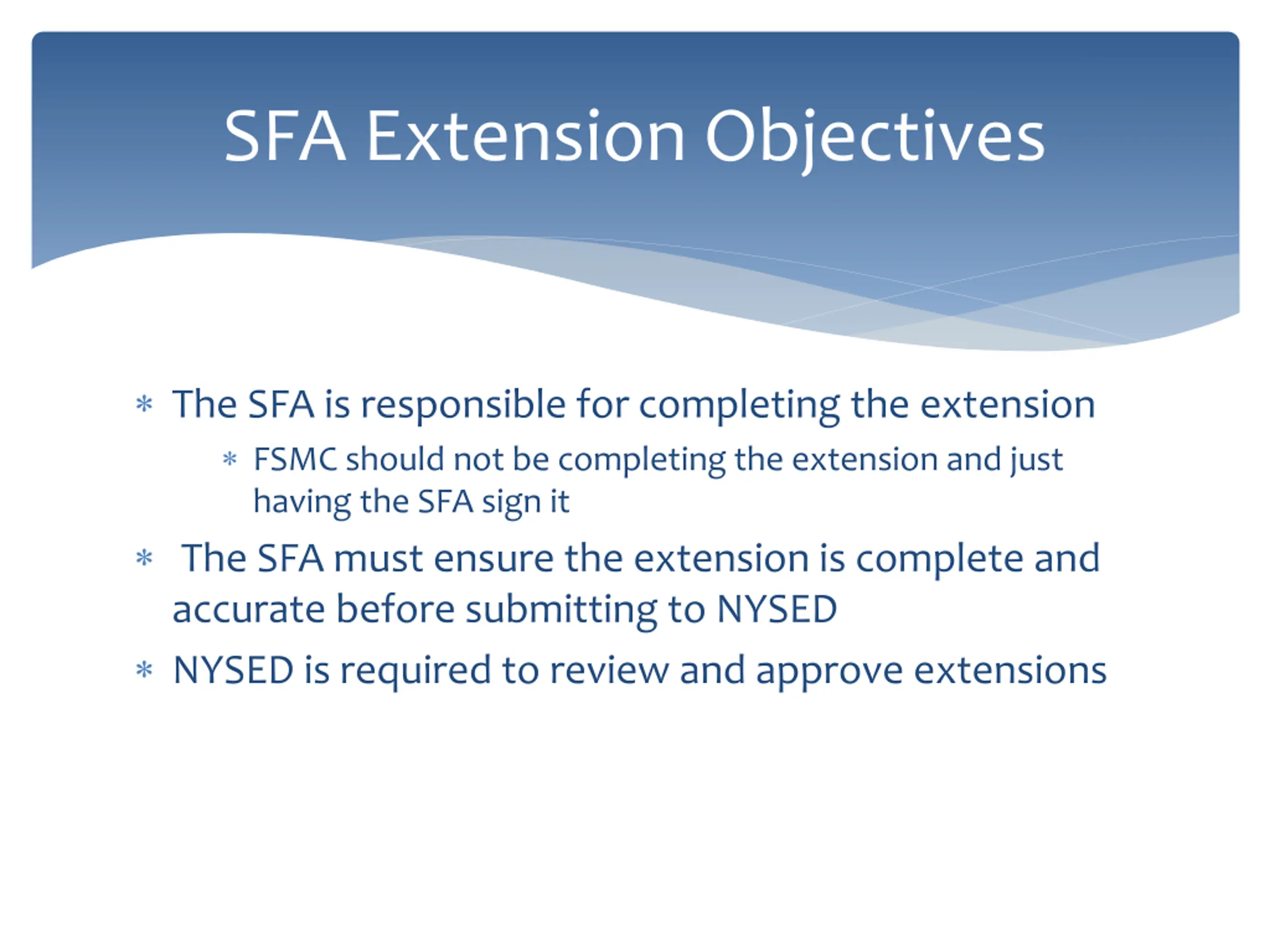 SFA Extension Objectives The SFA is responsible for completing the extension FSMC should not be completing the extension and just having the SFA sign it The SFA must ensure the extension is complete and accurate before submitting to NYSED NYSED is required to review and approve extensions