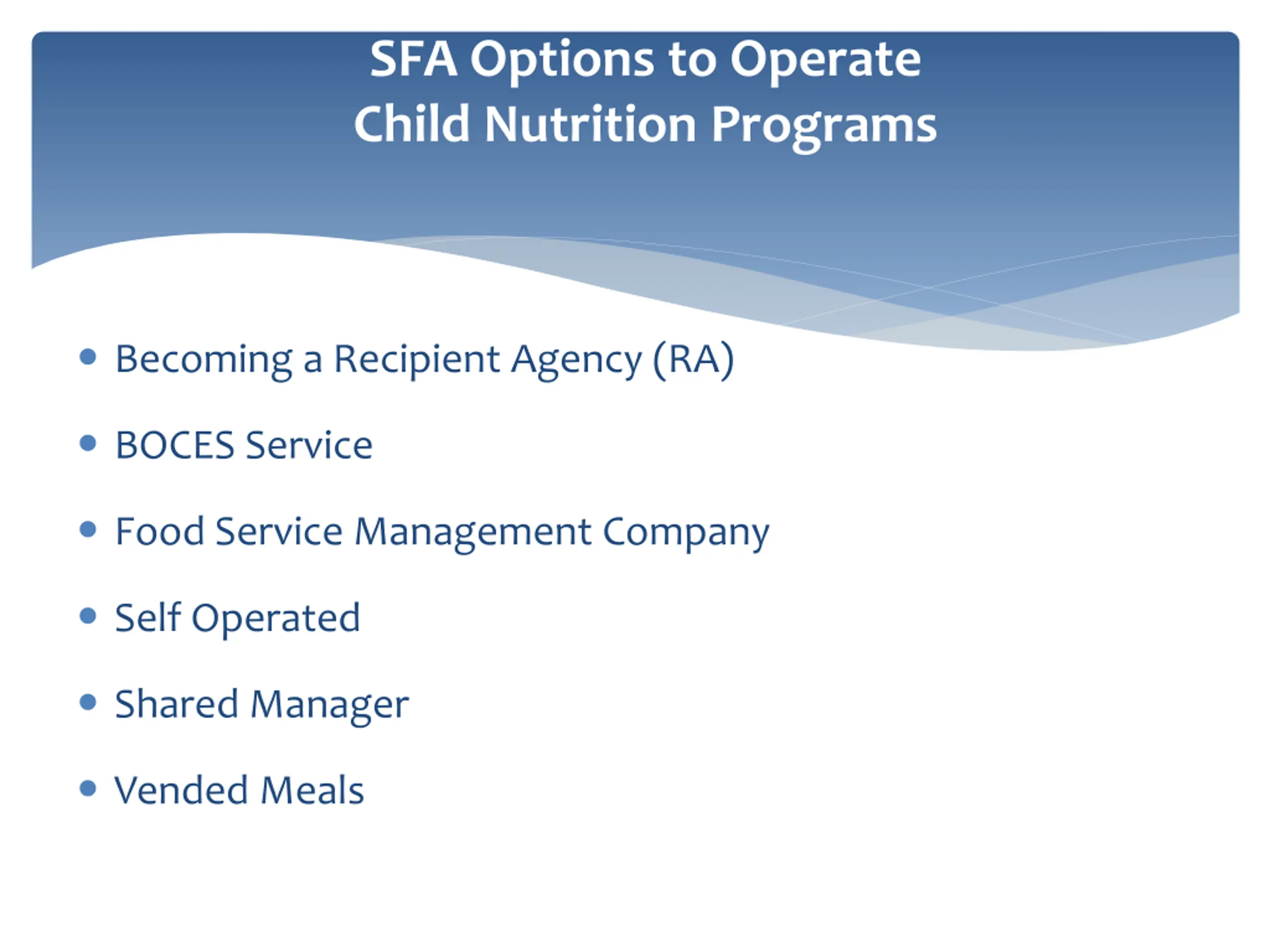 SFA Options to Operate Child Nutrition Programs Becoming a Recipient Agency (RA) BOCES Service Food Service Management Company Self Operated Shared Manager Vended Meals