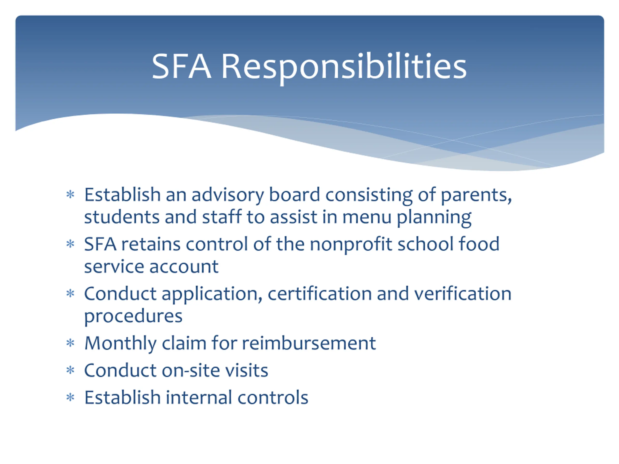 SFA Responsibilities Establish an advisory board consisting of parents, students and staff to assist in menu planning SFA retains control of the nonprofit school food service account Conduct application, certification and verification procedures Monthly claim for reimbursement Conduct on-site visits Establish internal controls