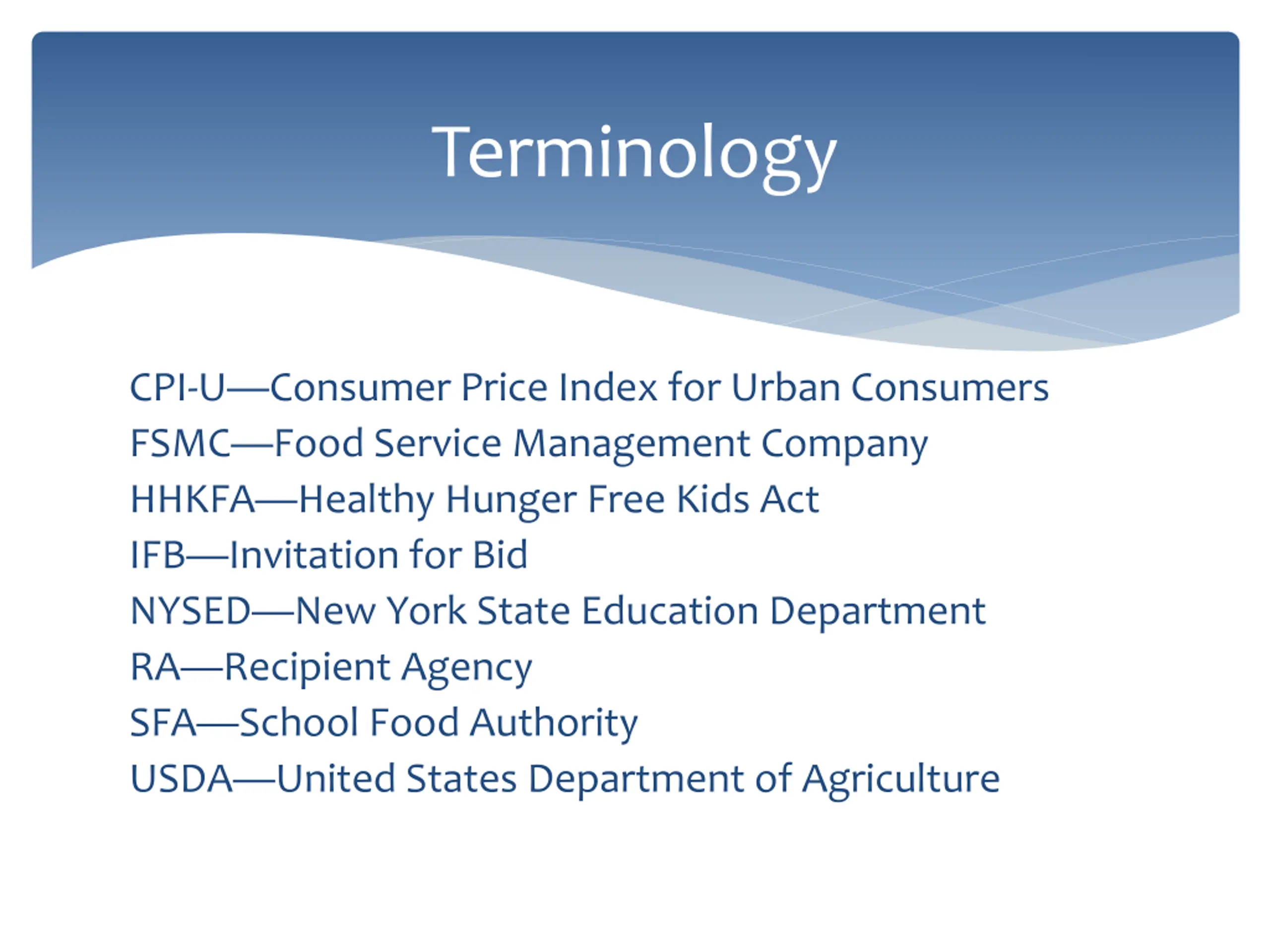 Terminology CPI-U Consumer Price Index for Urban Consumers FSMC Food Service Management Company HHKFA Healthy Hunger Free Kids Act IFB Invitation for Bid NYSED New York State Education Department RA Recipient Agency SFA School Food Authority USDA United States Department of Agriculture