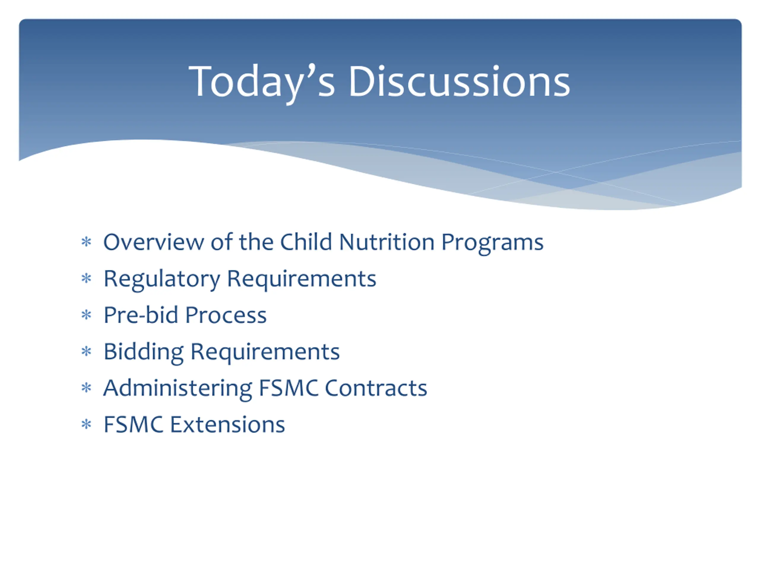 Todays Discussions Overview of the Child Nutrition Programs Regulatory Requirements Pre-bid Process Bidding Requirements Administering FSMC Contracts FSMC Extensions