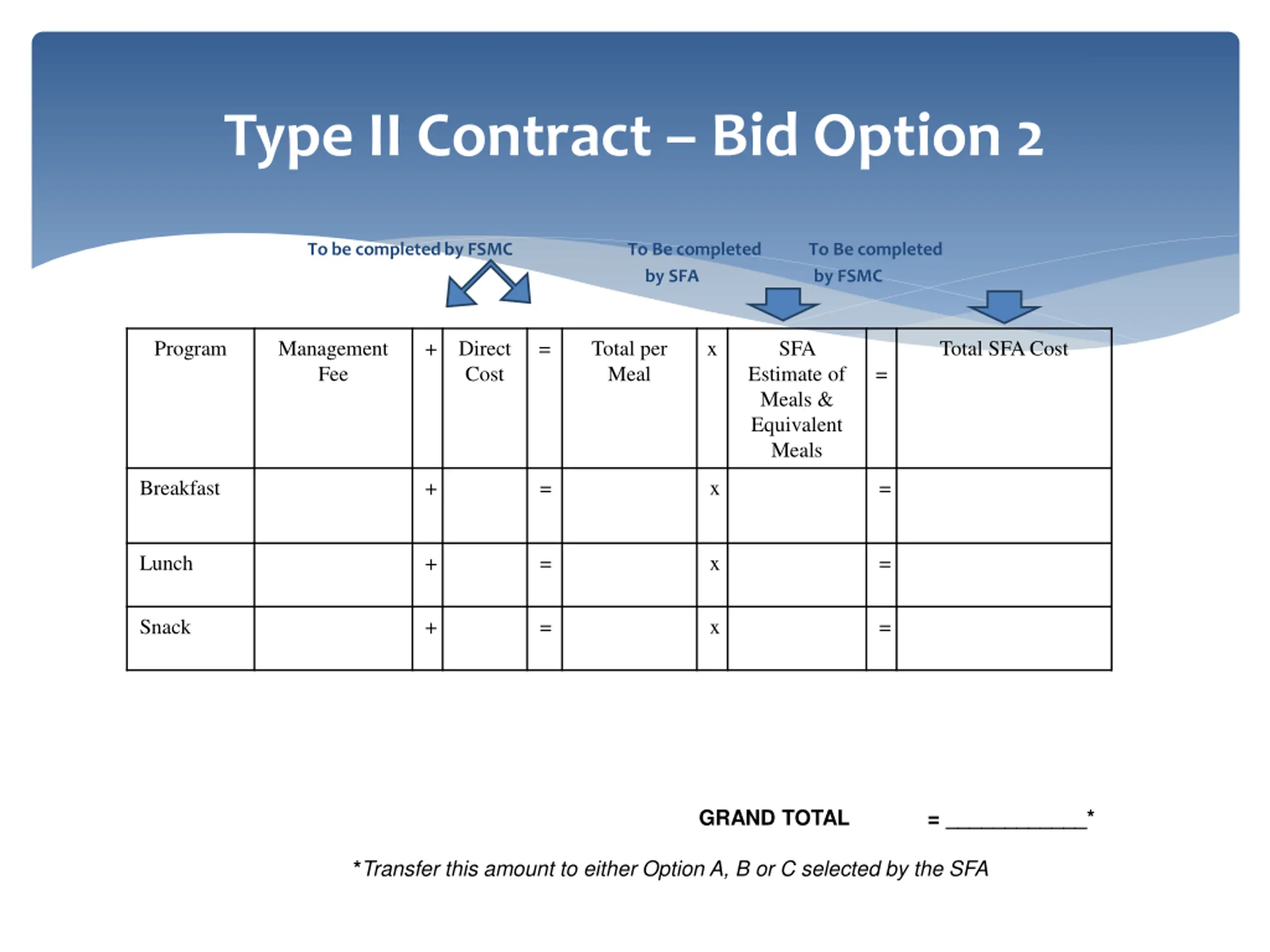 Type II Contract Bid Option 2 To be completed by FSMC To Be completed To Be completed by SFA by FSMC Program Management Fee + Direct Cost = Total per Meal x SFA Total SFA Cost Estimate of Meals & Equivalent Meals = Breakfast + = x = Lunch + = x = Snack + = x = GRAND TOTAL = ____________* *Transfer this amount to either Option A, B or C selected by the SFA