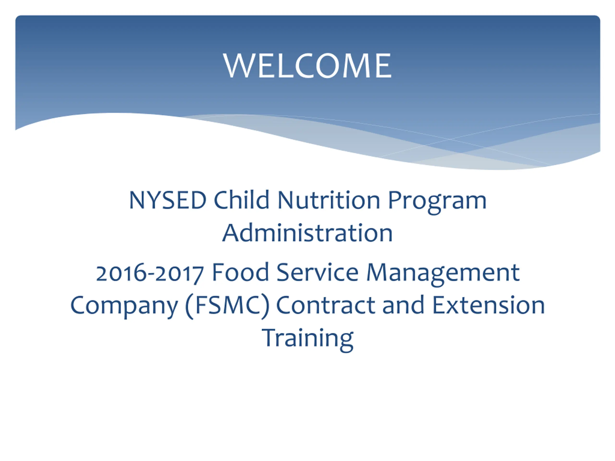 WELCOME NYSED Child Nutrition Program Administration 2016-2017 Food Service Management Company (FSMC) Contract and Extension Training