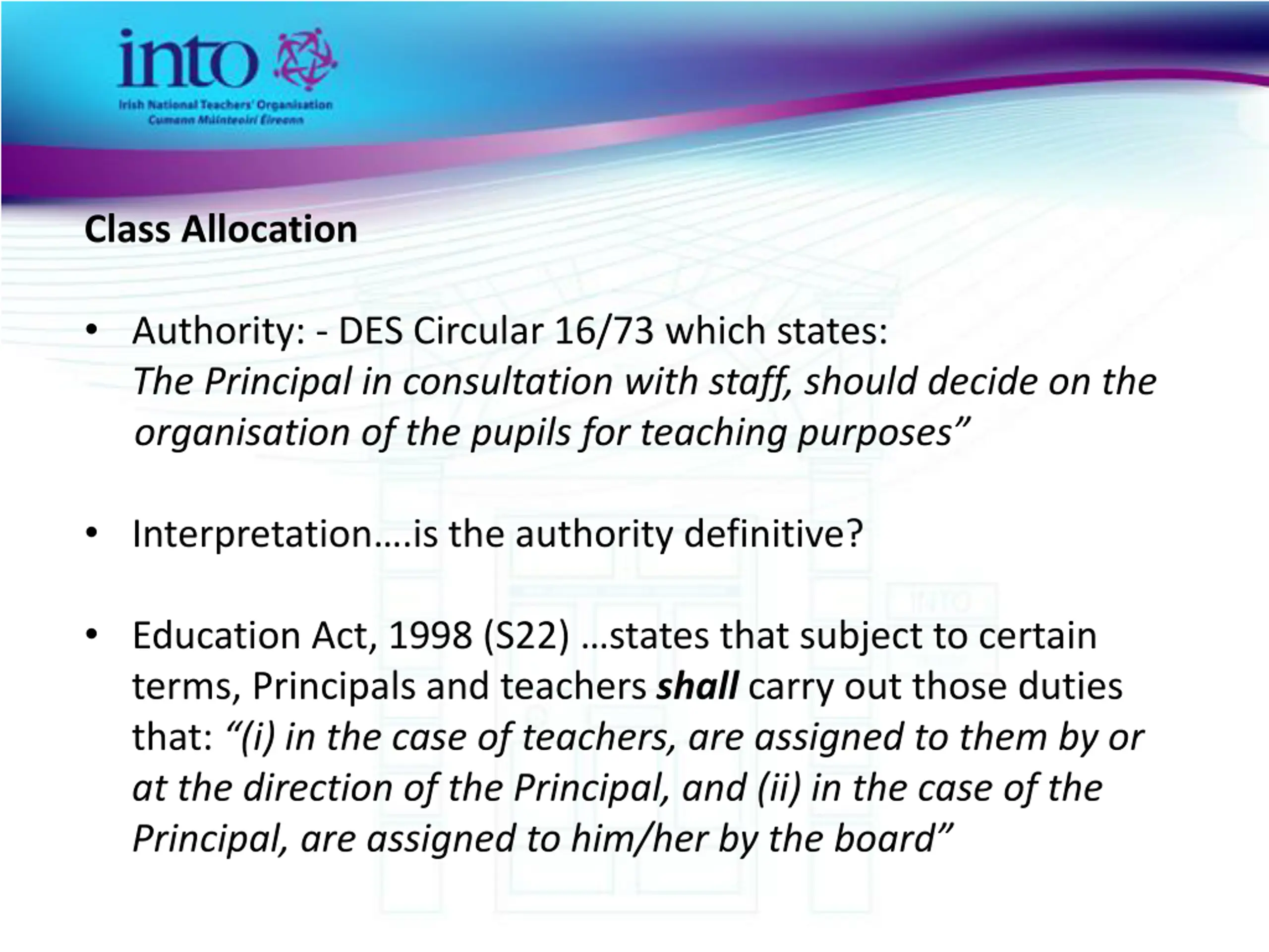 Class Allocation Authority: - DES Circular 16/73 which states: The Principal in consultation with staff, should decide on the organisation of the pupils for teaching purposes Interpretation .is the authority definitive? Education Act, 1998 (S22) states that subject to certain terms, Principals and teachers shall carry out those duties that: (i) in the case of teachers, are assigned to them by or at the direction of the Principal, and (ii) in the case of the Principal, are assigned to him/her by the board