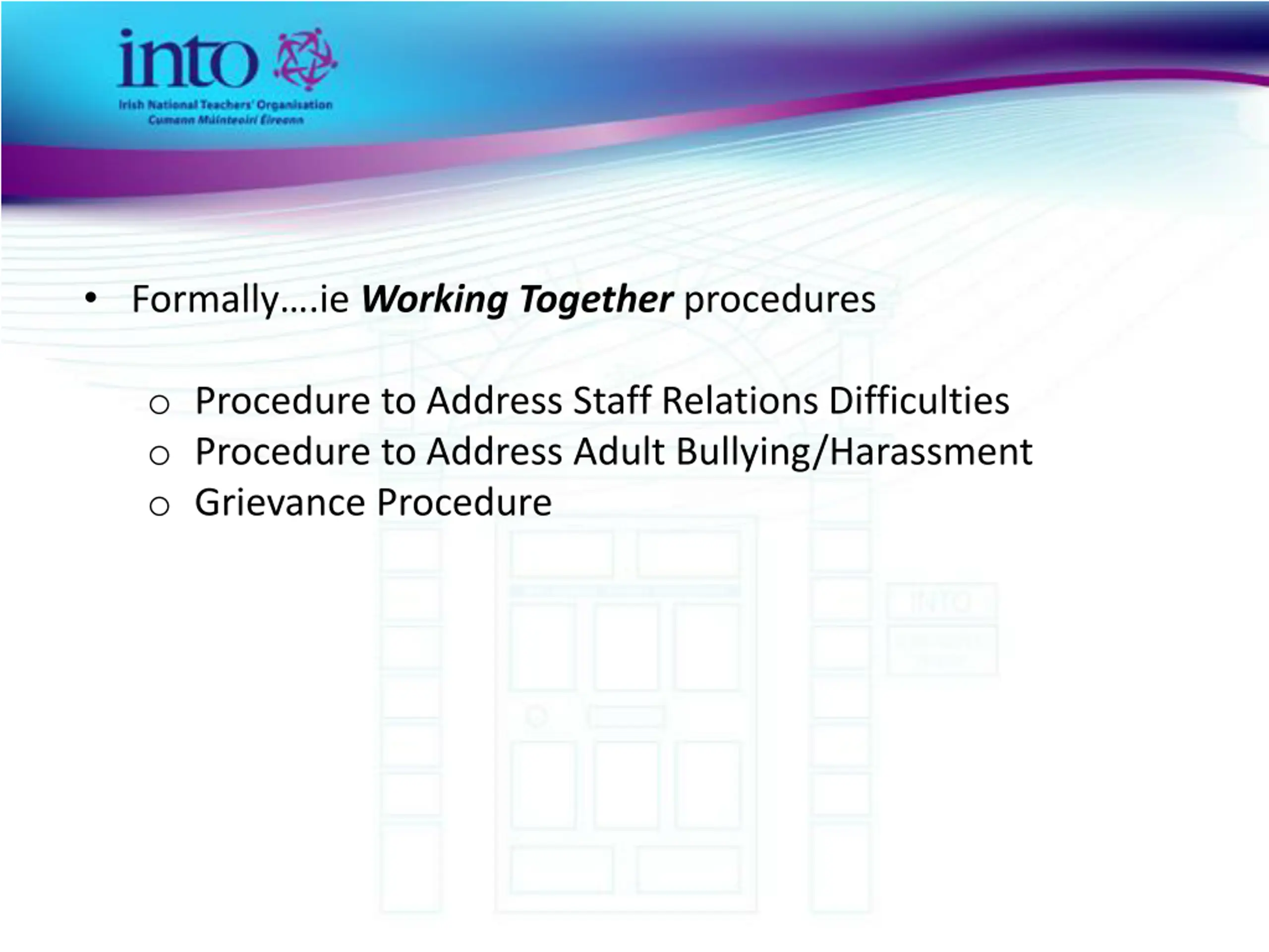 Formally.ie Working Togetherprocedures o Procedure to Address Staff Relations Difficulties o Procedure to Address Adult Bullying/Harassment o Grievance Procedure