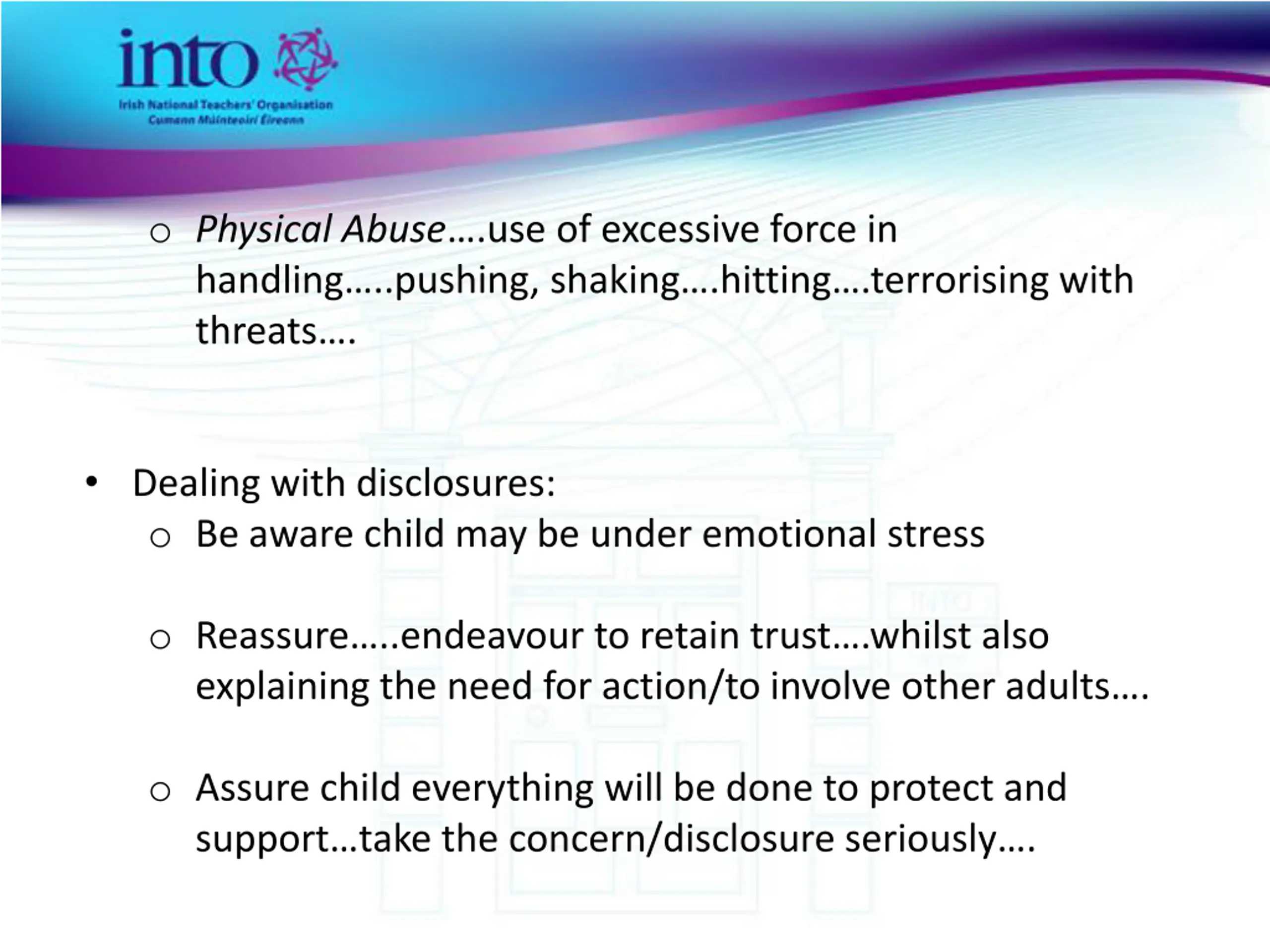 o Physical Abuse.use of excessive force in handling ..pushing, shaking .hitting .terrorising with threats . Dealing with disclosures: o Be aware child may be under emotional stress o Reassure ..endeavour to retain trust .whilst also explaining the need for action/to involve other adults . o Assure child everything will be done to protect and support take the concern/disclosure seriously .
