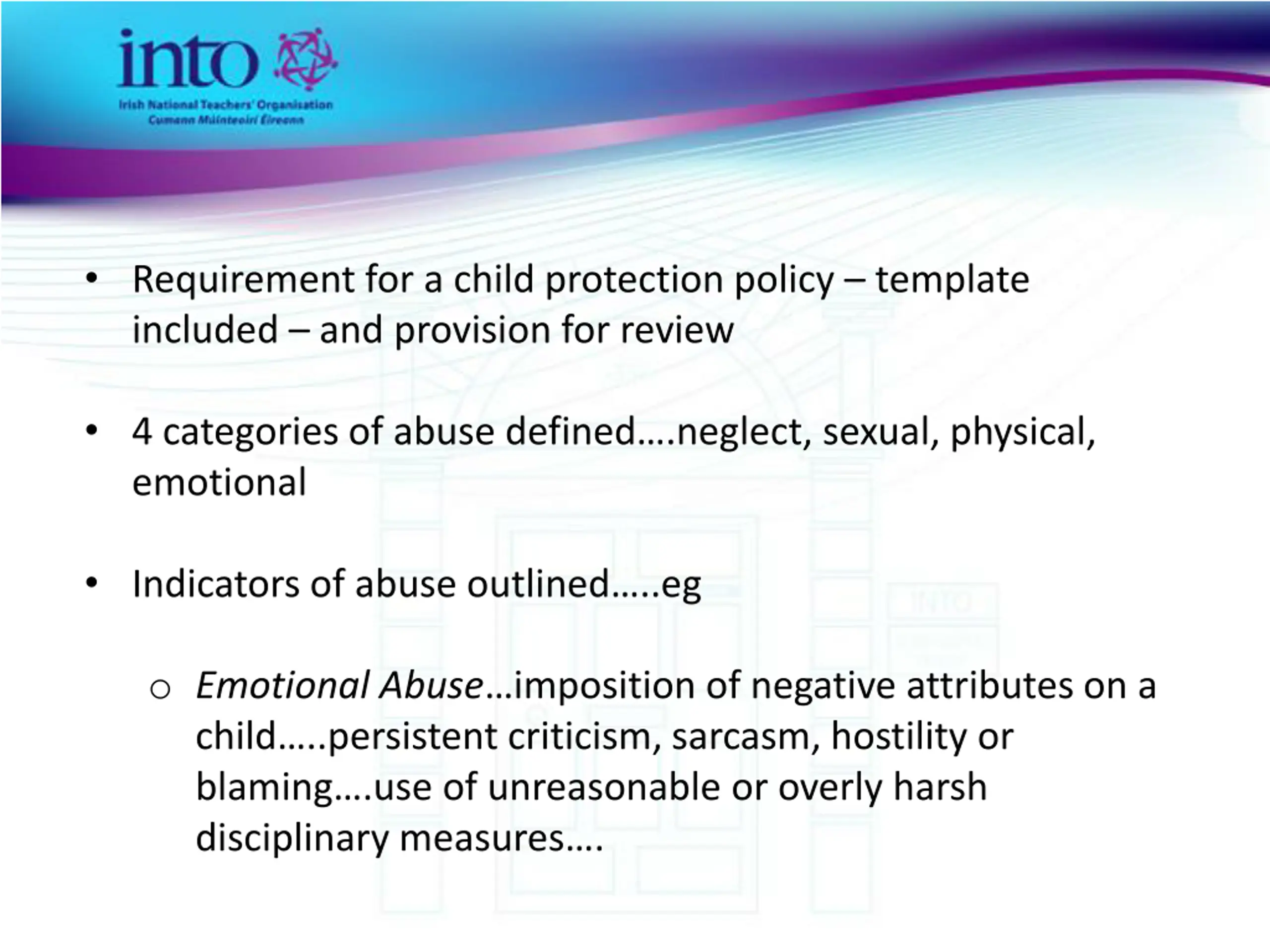 Requirement for a child protection policy template included and provision for review 4 categories of abuse defined .neglect, sexual, physical, emotional Indicators of abuse outlined ..eg o Emotional Abuse imposition of negative attributes on a child ..persistent criticism, sarcasm, hostility or blaming .use of unreasonable or overly harsh disciplinary measures .